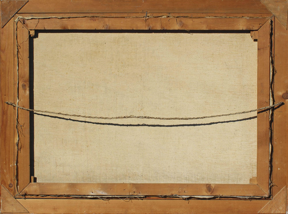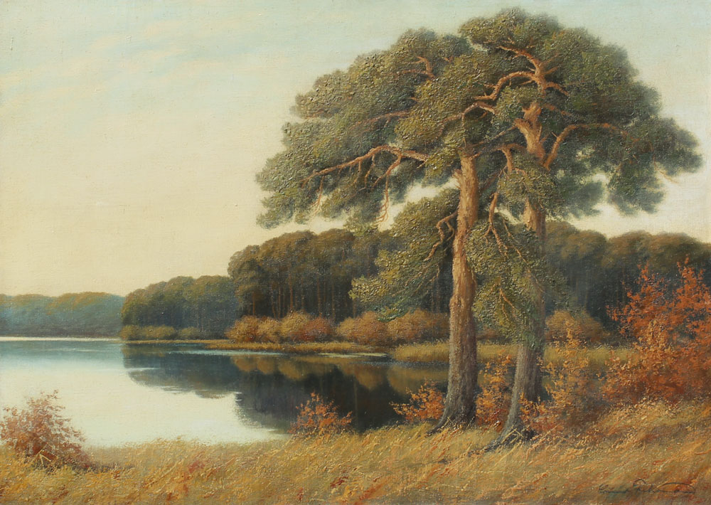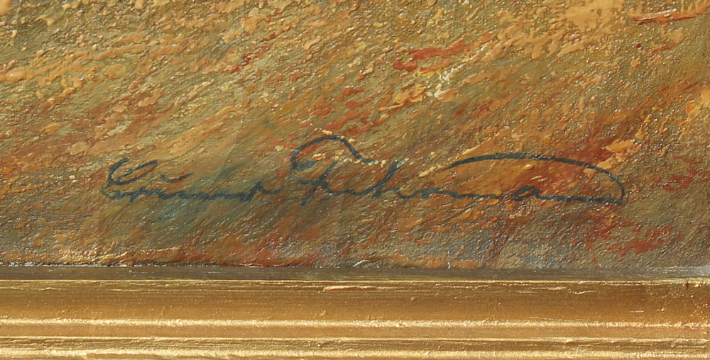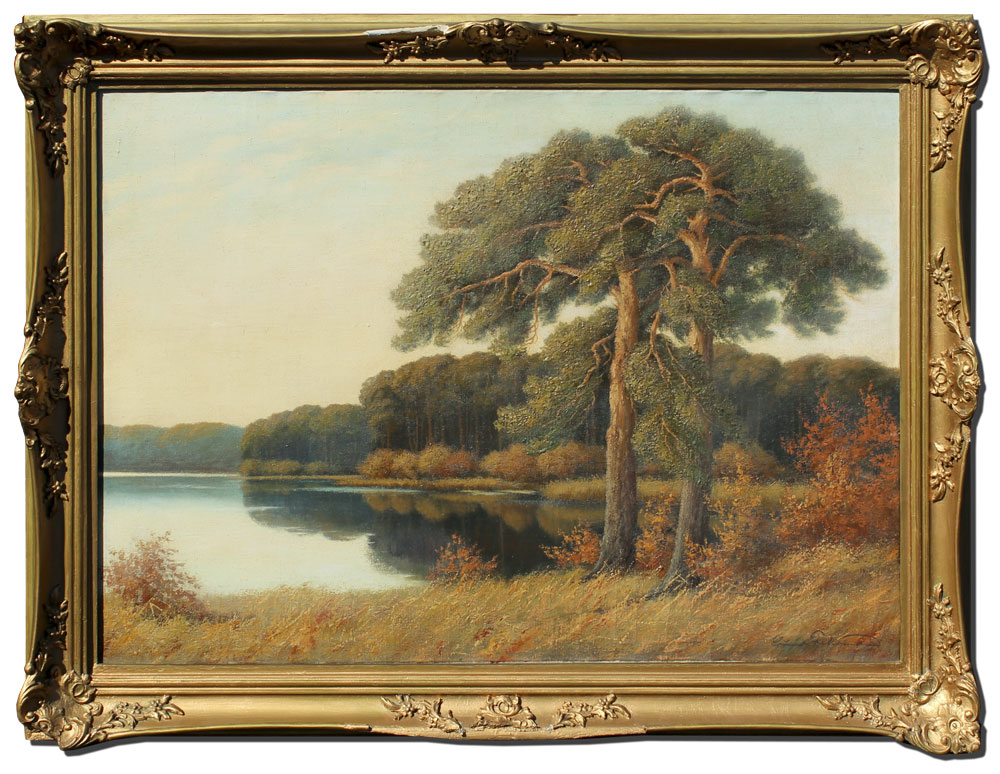 ILLEGIBLY SIGNED GERMAN LANDSCAPE WITH POND: Oil/Canvas, 28'' x 39 1/2'', repaired pierce-carved and gilded frame with over-paint, 34'' x 46''.