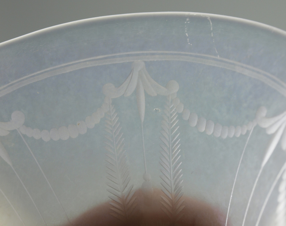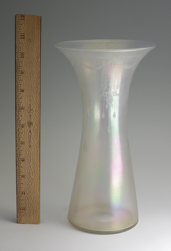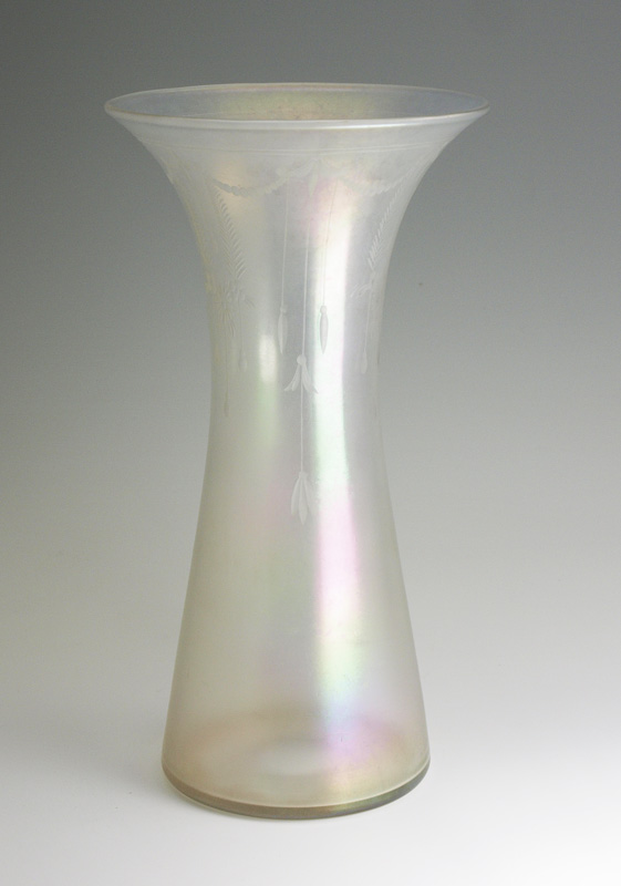 STEUBEN / HAWKES VERRE DE SOIE ART GLASS VASE: Iridescent etched glass, 8 1/2'' tall. Signed Hawkes.