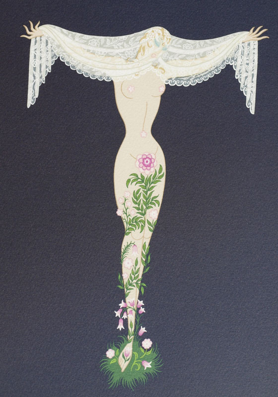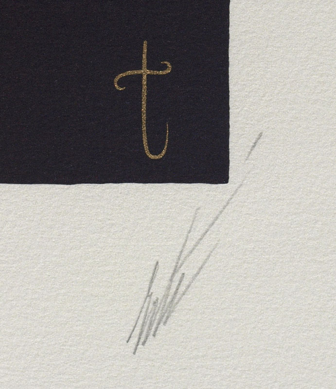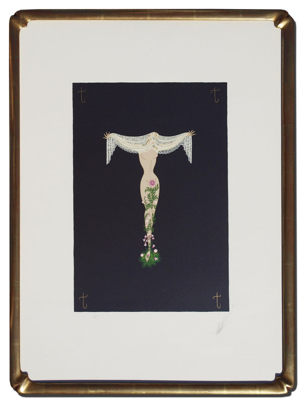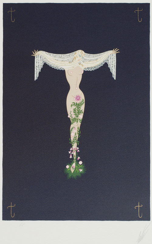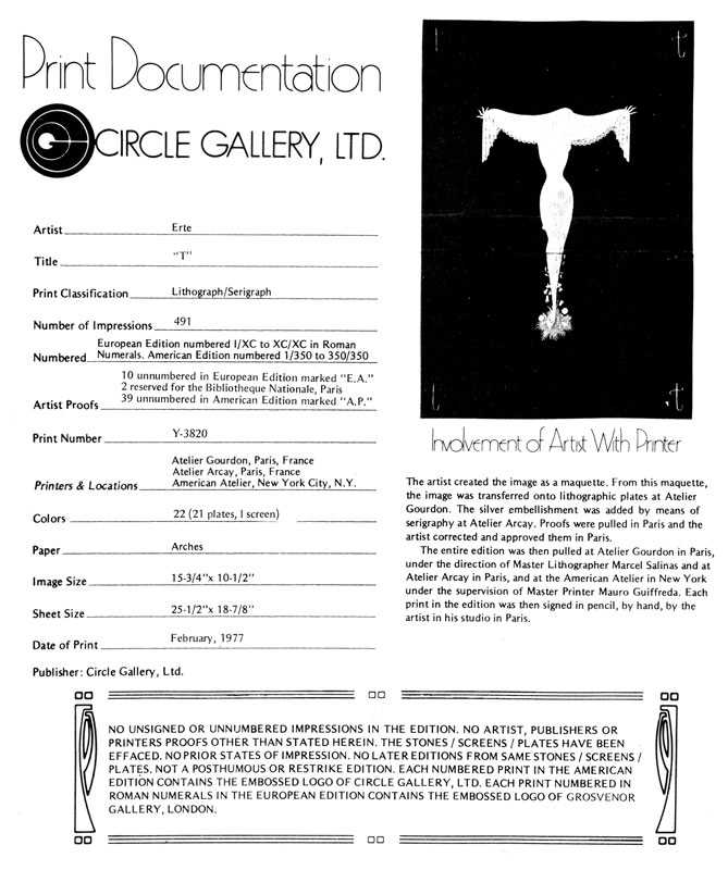 ERTE ALPHABET ''T'' SERIGRAPH: Sight size 24 3/4'' x 17 3/4'', pencil signed lower right, marked AP lower left (Artist Proof), encased in fine shaped and gilded wood frame, 26 1/2'' x 19 1/2''. Original Circle Gallery Certificate of Authenticity included.