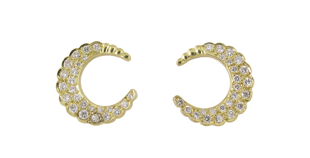 14K DIAMOND CRESCENT EARRINGS: 14K yellow gold earrings contain 48 round brilliant cut diamonds. Weight: .75 Ct. Approx. The diamonds average VS in clarity and G-H in color. The diamonds are pav‚ set. Weight: 4.7 grams. Post and nut closures.