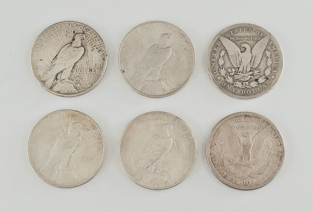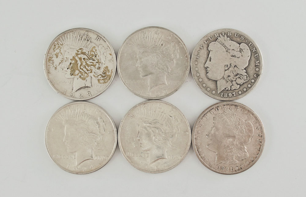 2 MORGAN AND 4 PEACE SILVER DOLLARS: To include Morgan dollars 1897-O, 1921-S. Peace dollars 1923, 1923-S, 2 1924. Ungraded.