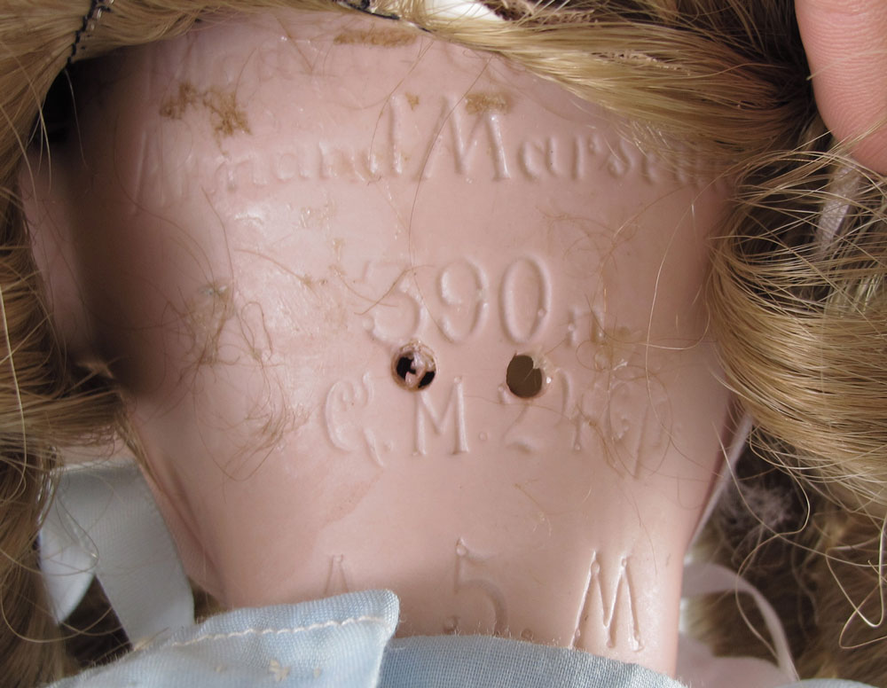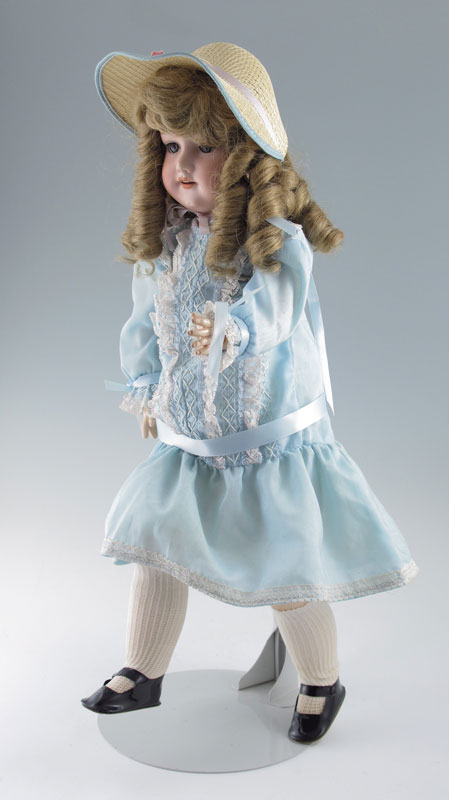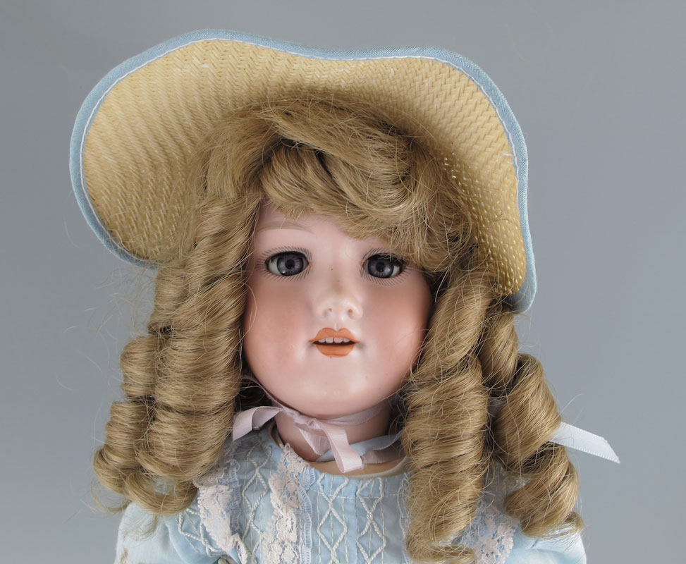 ARMAND MARSEILLE PORCELAIN DOLL: 22'' tall with sleepy blue eyes, open mouth with teeth, jointed arms and legs. Later clothes.