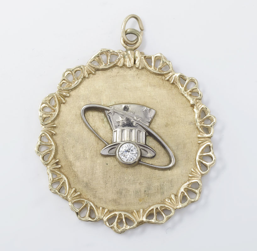 14K GOLD .25 CT DIAMOND TOP HAT PENDANT / CHARM: 14K yellow gold 25.0 mm disc charm with applied stars & stripes top hat and hoop with a round brilliant cut diamond pf approx. .25 Ct. The diamond is rated SI in clarity and H-I in color. The diamond is bezel set. Reticulated and scalloped frame. Weight: 11.4 grams.
