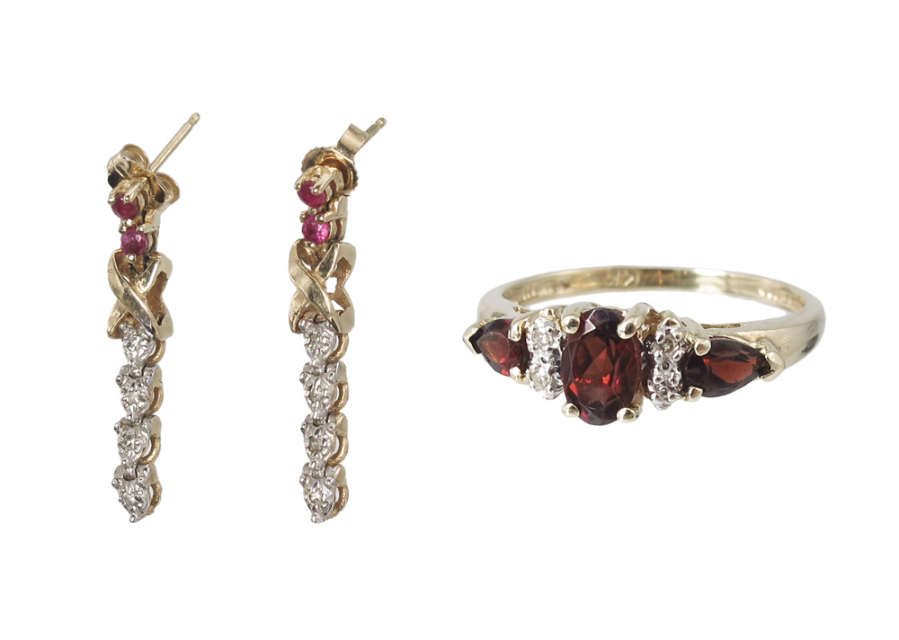 RUBY AND DIAMOND EARRINGS AND GARNET RING: 14K yellow gold EARRINGS contains 8 round full cut diamonds. Weight: .04 Ct. Approx. The diamonds average I1 in clarity and I-J in color. 4 round mixed cut rubies. Weight: .30 Ct. Approx. The diamonds and rubies are prong set. Post and nut closures. Weight: 2.3 grams. The RING: 14K yellow gold ring contains 4 round single cut diamonds. Weight: .02 Ct. Approx. The diamonds average VS in clarity and H-I in color. One oval and two pear mixed cut garnets. Weight: 1.50 Ct. Approx. The diamonds and garnets are prong set. Weight: 1.9 grams. Size: 7