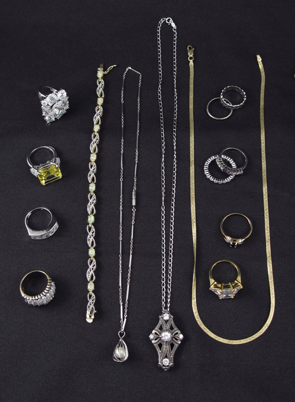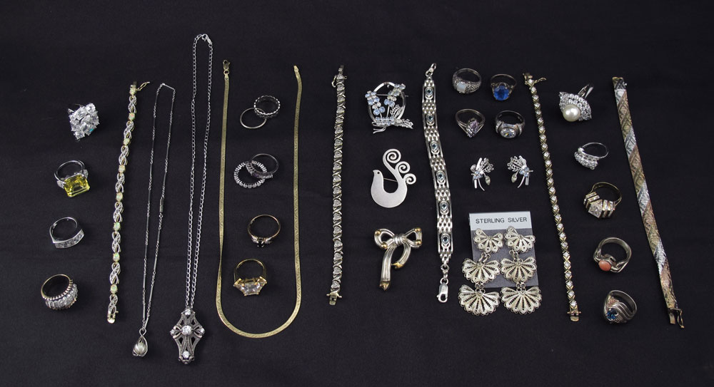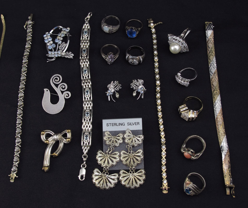 TRAY LOT STERLING JEWELRY: To include 17 fashion rings, Star Art pin and earring set, 5 bracelets, 2 pins and 3 necklaces. 7.3. troy oz.