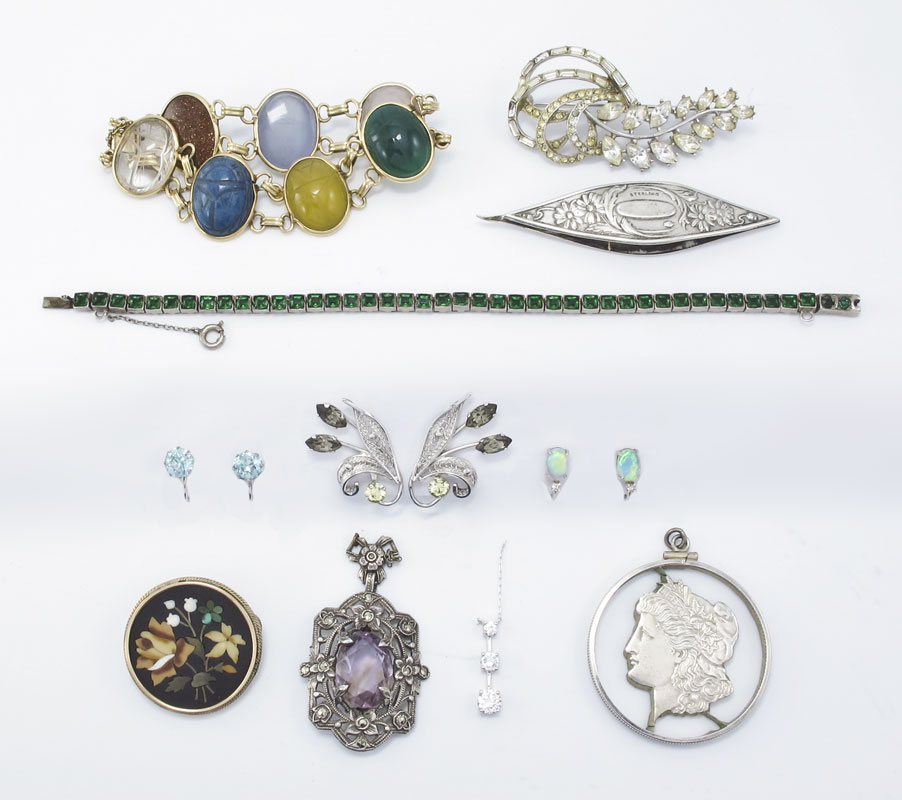 LOT OF STERLING AND COSTUME JEWELRY: One rhinestone brooch, gold filled scarab bracelet, gold filled mosaic brooch, cut-out coin pendant, sterling earrings with paste, sterling earrings with zircon, sterling green stone bracelet, sterling amethyst and marcasite pendant, sterling tatting shuttle, 10K CZ pendant and 14K opal and diamond earrings. 14K weight: 2.1 grams. 10K weight: 1.0 grams. Sterling weight: 37.3 grams.