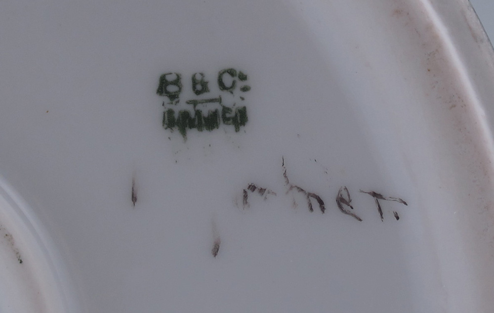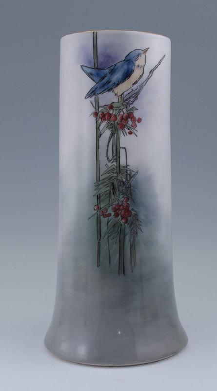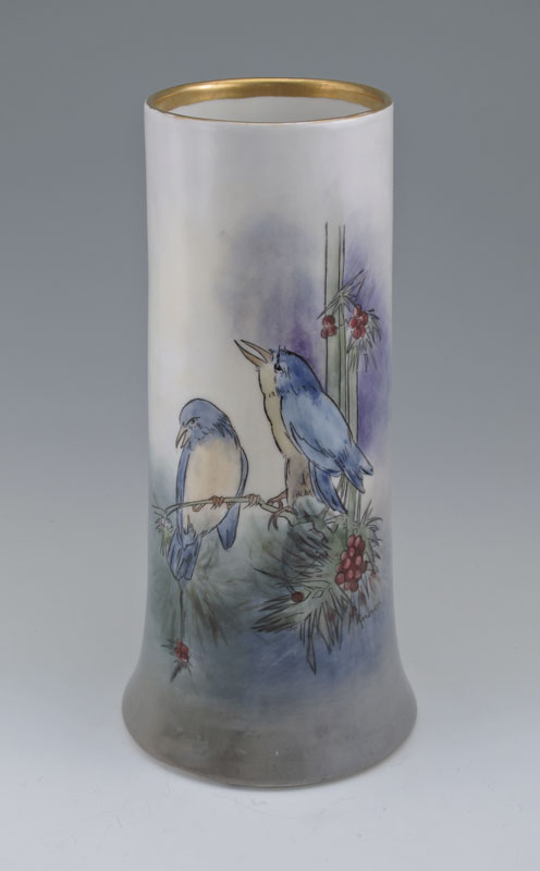 H. BALLEROY FRENCH LIMOGES PORCELAIN VASE WITH BIRDS: Mark 1, circa 1908-1930, handpainted three blue birds on berry bush, artist signed Gardner, 12 1/2''h.