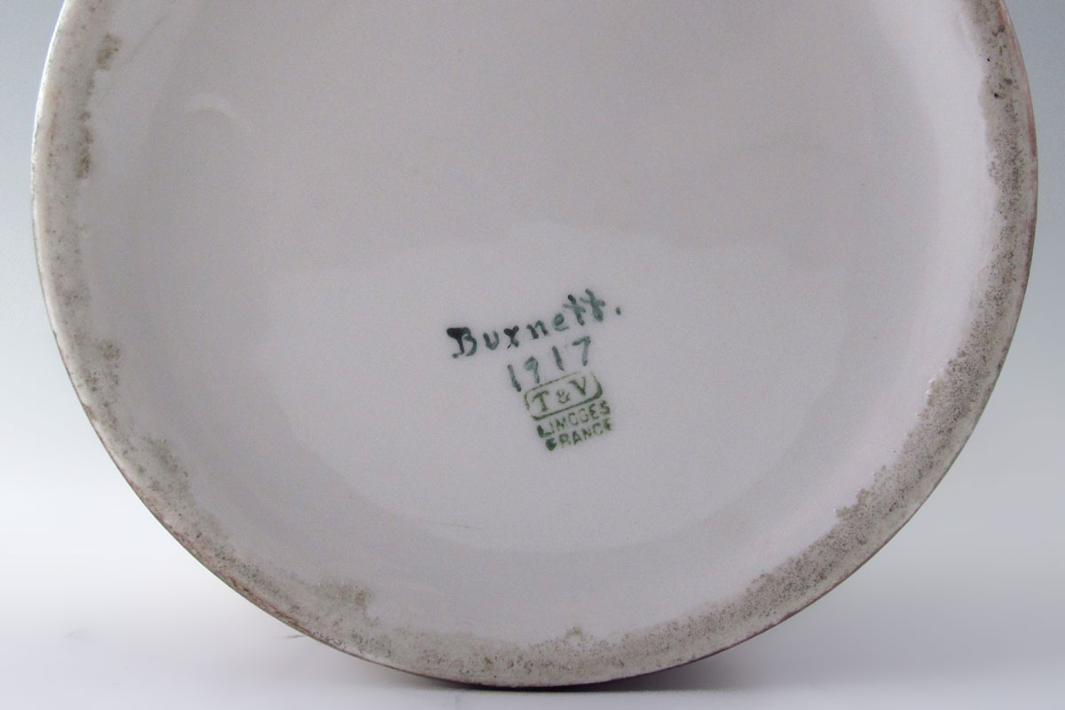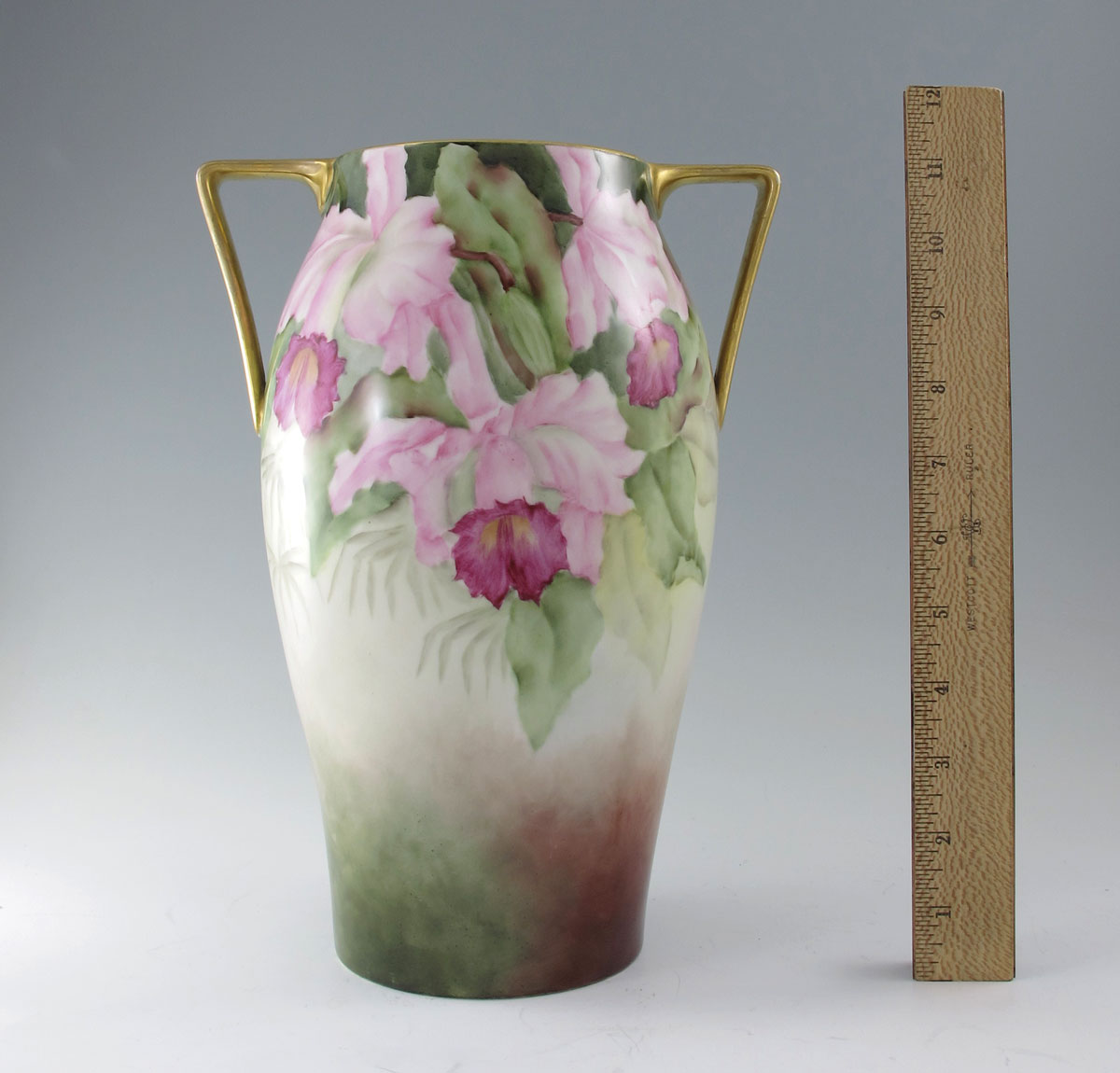 TRESSEMANN & VOGT LIMOGES HAND PAINTED PORCELAIN VASE: Double handled baluster vase, pink and purple orchids on a green ground, artist signed Burnett dated 1917, gilt trim, 11 1/8''h. x 8 1/4''.
