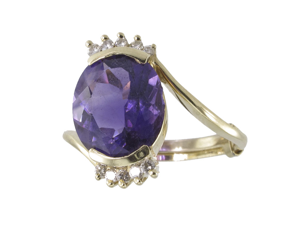 14K AMETHYST & DIAMOND RING: 14K yellow gold ring centers a single 4 ct oval mixed cut amethyst. Rated VVS in clarity (Type I), P in Hue, 4-5 in Tone and 3-4 in Saturation. 8 round brilliant cut diamonds. Weight: .12 Ct. Approx. The diamonds average VS in clarity and L-M in color. The amethyst and diamonds are prong set. Weight: 4.0 grams. Size: 9