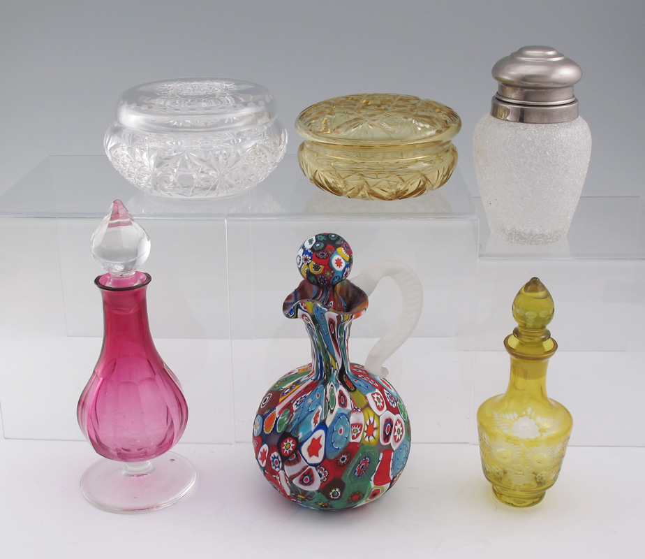 ESTATE COLLECTION OF GLASS DRESSER JARS AND BOTTLES: Includes signed Sinclair brilliant cut glass jar, 4 1/2'' dia. Millifiori cruet, cranberry glass, etched yellow glass, overshot, and yellow cut to clear.