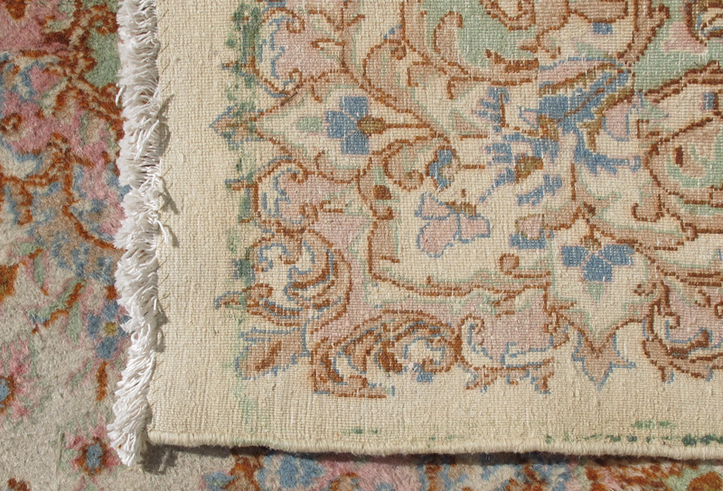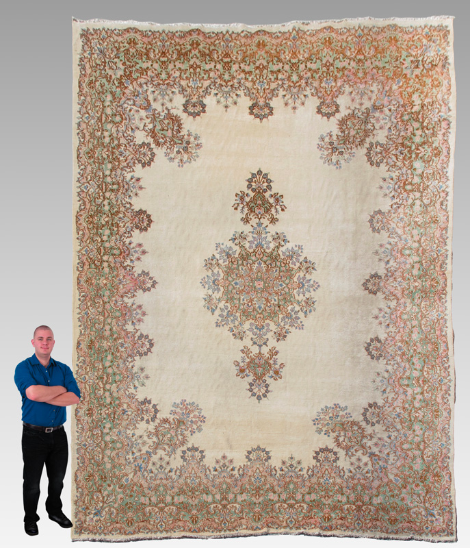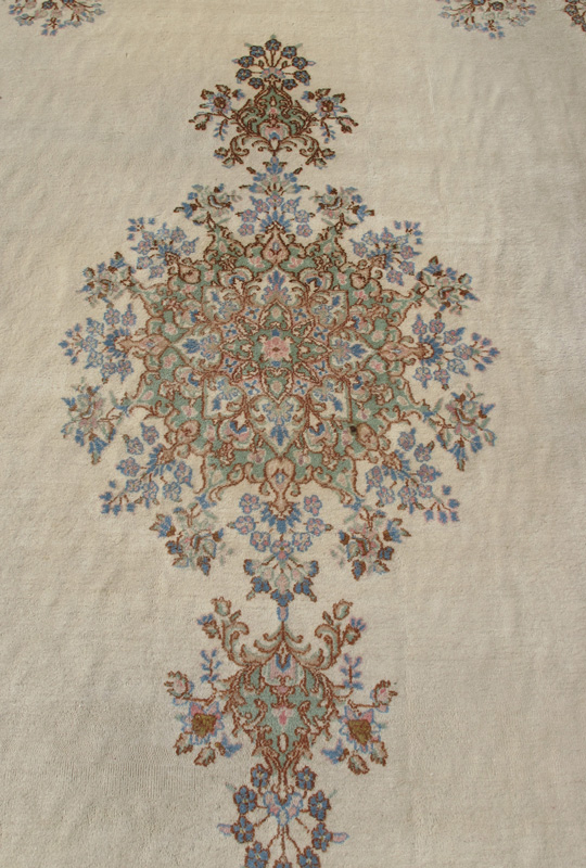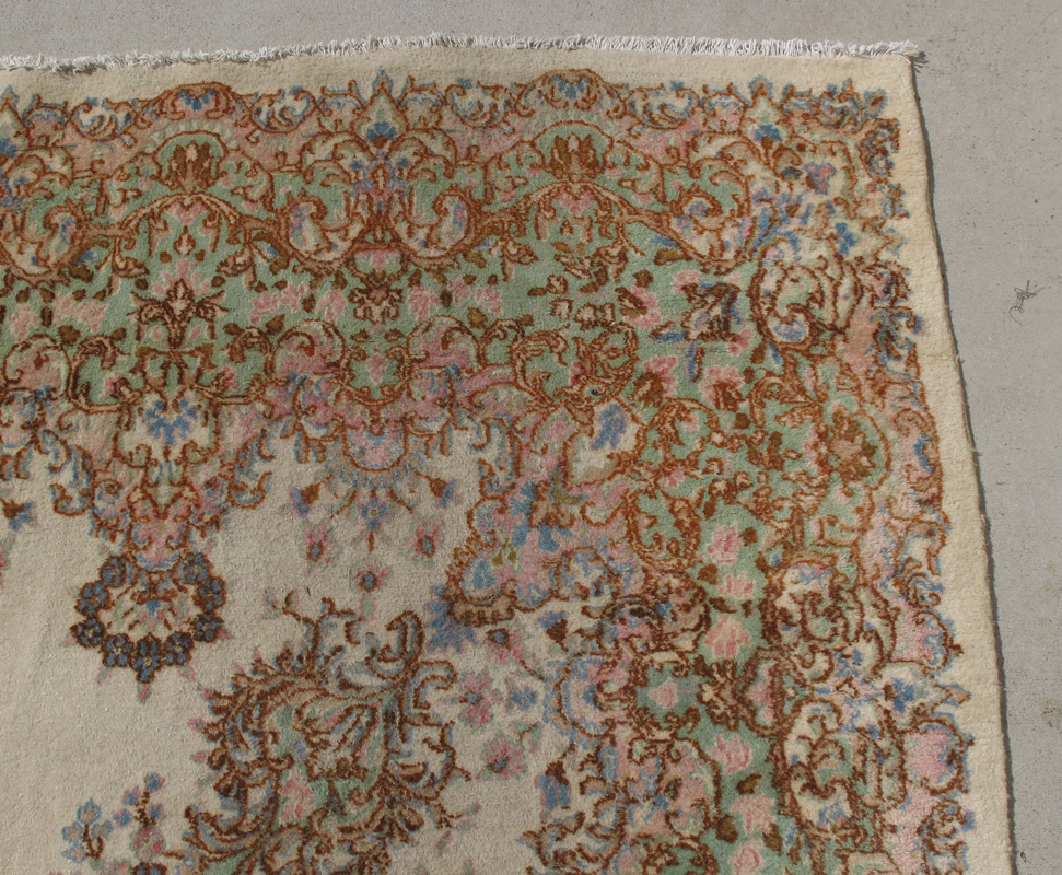 SEMI ANTIQUE PERSIAN KERMAN HAND KNOTTED WOOL RUG, 10' x 16': This palace size rug has traditional designs and colors of a Kerman rug. There are pastel blues, pinks, greens, and even a little cinnamon brown to spice it up. This large size with the open field and central medallion has been found in very grand settings the world over. Condition is good.
