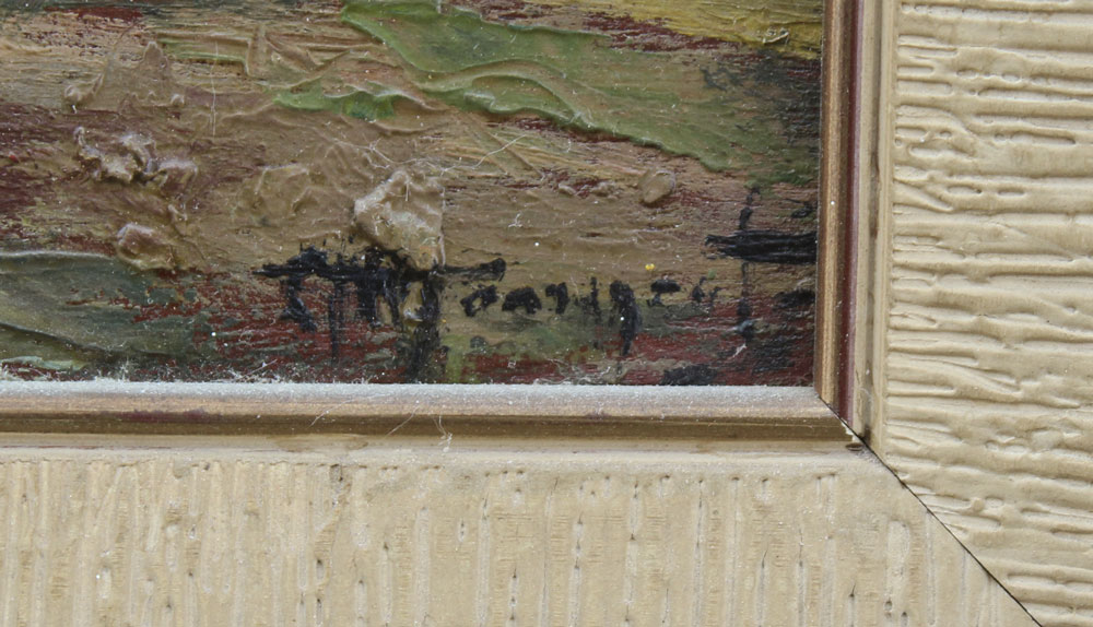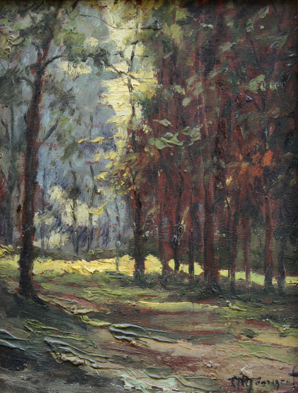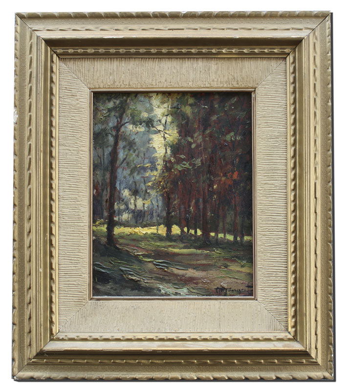MONSAGRATI, Alessandro, (Italian, 1884-1966): Forest Path, Oil/Board, 9 3/4'' x 7 3/4'', signed lower right, carved and painted frame, 16 1/4'' x 14''.