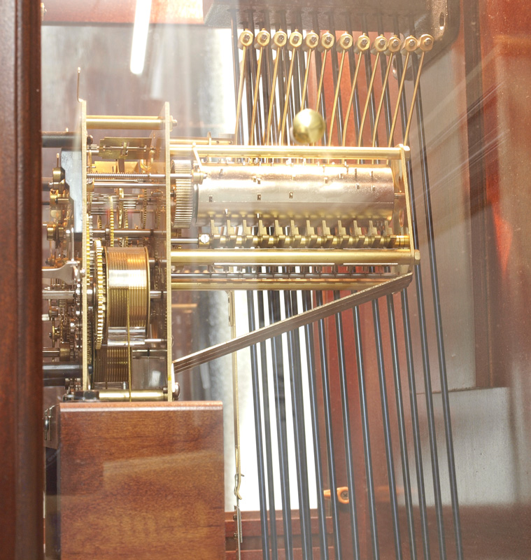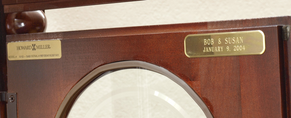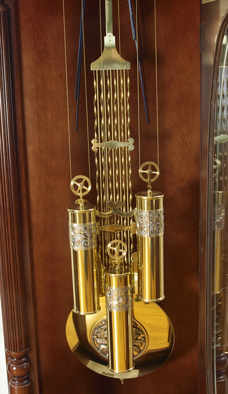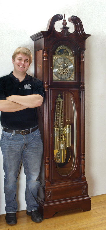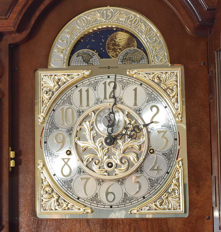 HOWARD MILLER STEWART MODEL GRANDFATHER CLOCK: The ''Stewart'' model by Howard Miller with mahogany case. Broken arch pediment with spire finial, fluted half column decoration, illuminated interior. Mixed metal face with moonphase, 3 chimes included Westminster, Ave Maria and Beethoven's 9th. Embossed pendulum and weights. Sold with original paperwork and instructions. Key and crank in office. Originally retailed for $4500.00. Measures 86 1/2'' h. x 23 1/4'' x 13 1/4''.