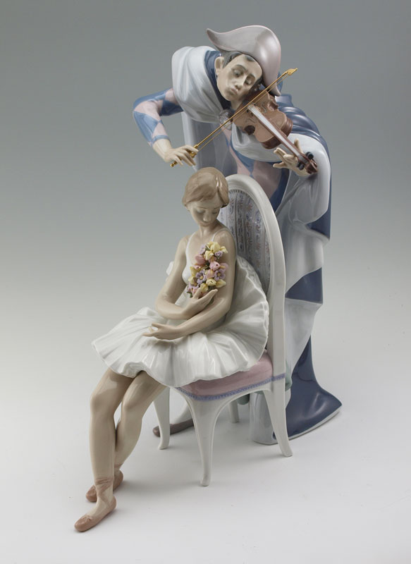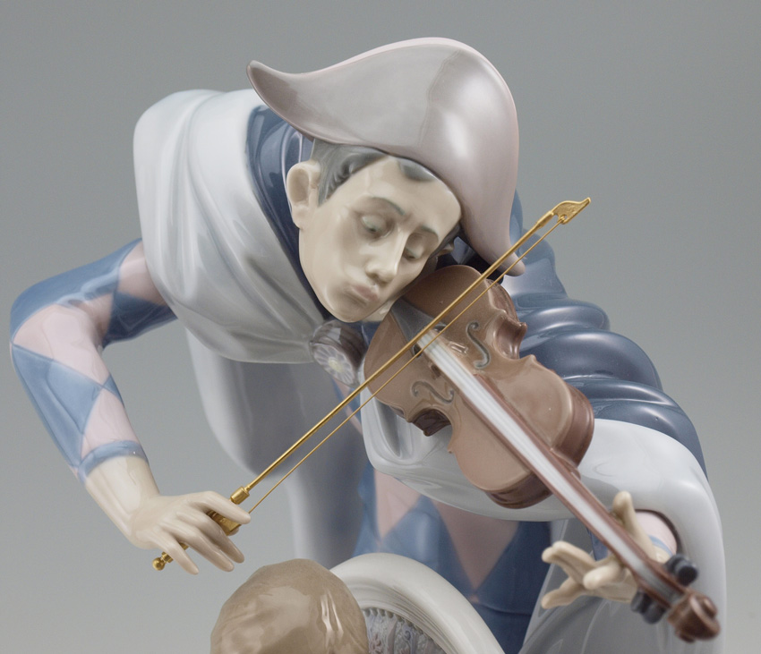 LLADRO PORCELAIN FIGURINE JESTER SERENADE: #5932, Antonio Ramos designer, glazed, Limited Edition, issued 1993 retired 1994, 15''h, approx. 13 3/4'' x 8''. With original box.