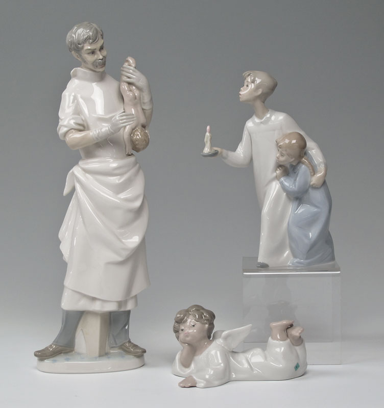 LLADRO PORCELAIN FIGURINES: 3 figures to include, OBSTETRICIAN #4763.3, Salvador Furio designer, issued 1971 retired 1992, Reduced 14 1/4'' x 4 3/4'', with box; RECLINING ANGEL #4541, Fulgencio Garcia designer, issued 1969, glazed, 2 1/2'' x 5 1/2'', no box; BOY & GIRL #4874, in nightshirts with candle, Fulgencio Garcia designer, issued 1974 retired 1997, glazed, 8 1/4'' x 5'', with box.