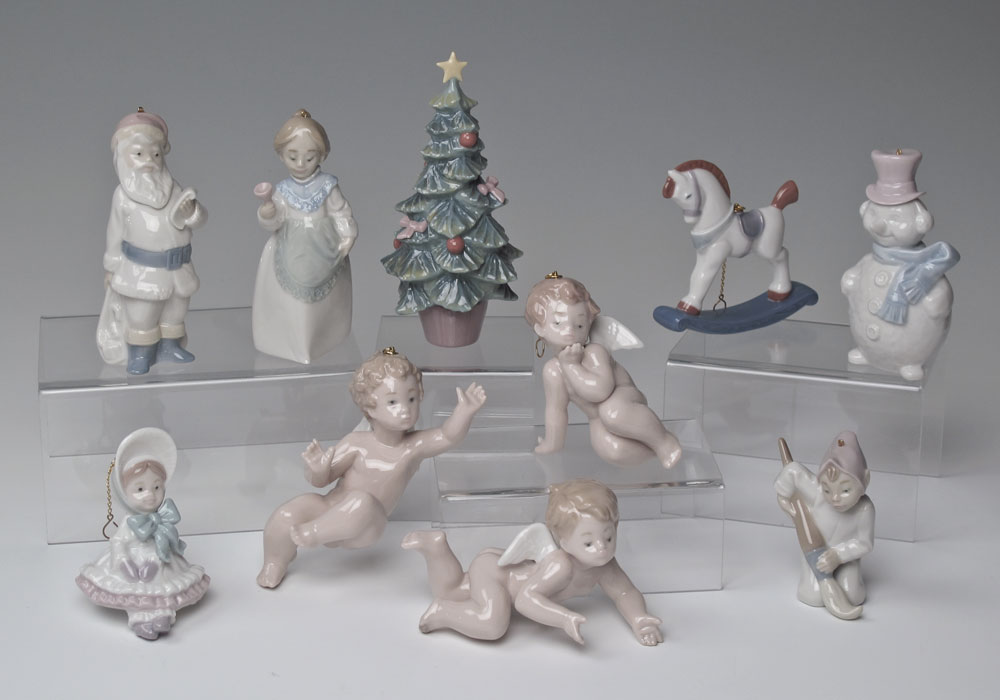 LLADRO PORCELAIN ORNAMENTS: 10 Pieces to include, Joan Coderch designer - SNOWMAN #5841, issued 1991 retired 1993, 4''; SANTA #5842, issued 1991 retired 1993, 4 3/4''; ELF #5938, issued 1992 retired 1993, 3 1/4''; Mrs. Claus #5939, issued 1992 retired 1993, 4 1/2''. Francisco Polope designer - SURPRISED CHERUB #6253, issued 1995 retired 1997, 2''; PLAYING CHERUB #6254, issued 1995 retired 1997, 2''; THINKING CHERUB #6255, issued 1995 retired 1997, 3''. Design & Decoration Dept designs - CHRISTMAS TREE #6261, issued 1995, 5 1/2''. Jose Alvarez designer - ROCKING HORSE #6262, issued 1995 retired 1997, 3 1/2''. Marco Nogueron designer - DOLL #6263, issued 1995 retired 1997, 3 1/4''. All with boxes, sold as a lot.