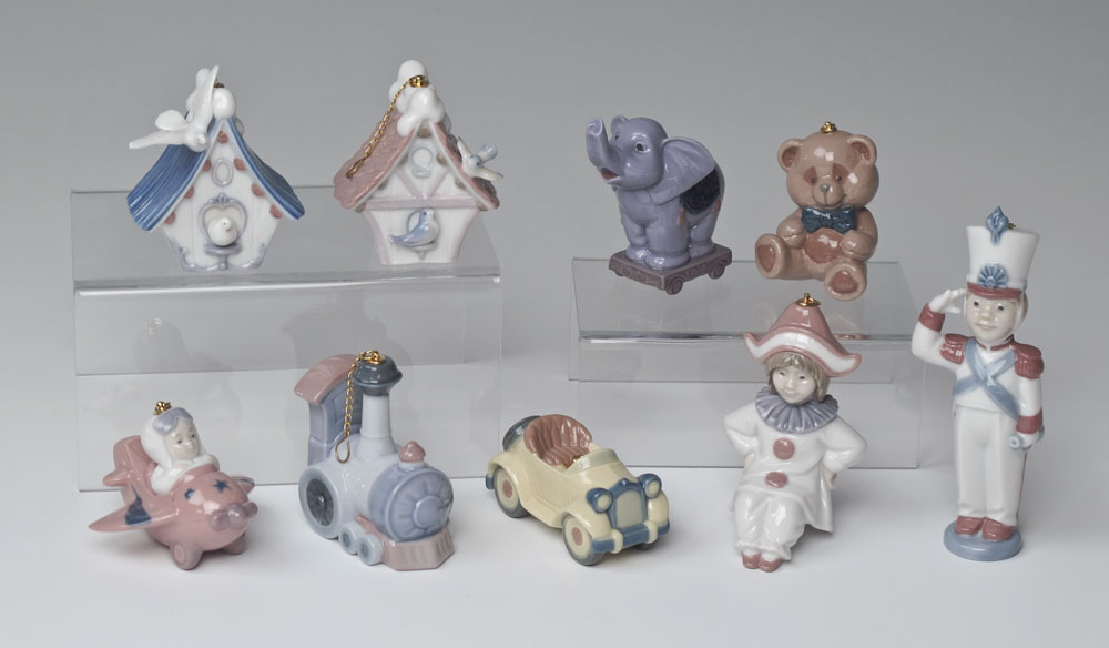 LLADRO PORCELAIN ORNAMENTS: 9 Pieces to include, Design & Decoration Dept design - TRAIN #6264, issued 1995 retired 1997, 2''; WELCOME HOME #6335, issued 1996 retired 1997, 2 3/4''; HOME SWEET HOME #6336, issued 1997 retired 1998, 3 1/4''; LITTLE ROADSTER #6381, issued 1997 retired 1998, 2''; LITTLE HARLEQUIN #6386, issued 1997 retired 1998, 4''; CIRCUS STAR #6388, issued 1997 retired 1998, 3''. Jose Malavia designer - LITTLE AVIATOR #6343, issued 1996 retired 1997, 2 3/4''. Jose Aliena designer - TEDDY BEAR #6344, issued 1996 retired 1997, 3''. Miguel Santaeulalia designer - TOY SOLDIER #6345, issued 1996 retired 1997, 5''. All with boxes, sold as a lot.