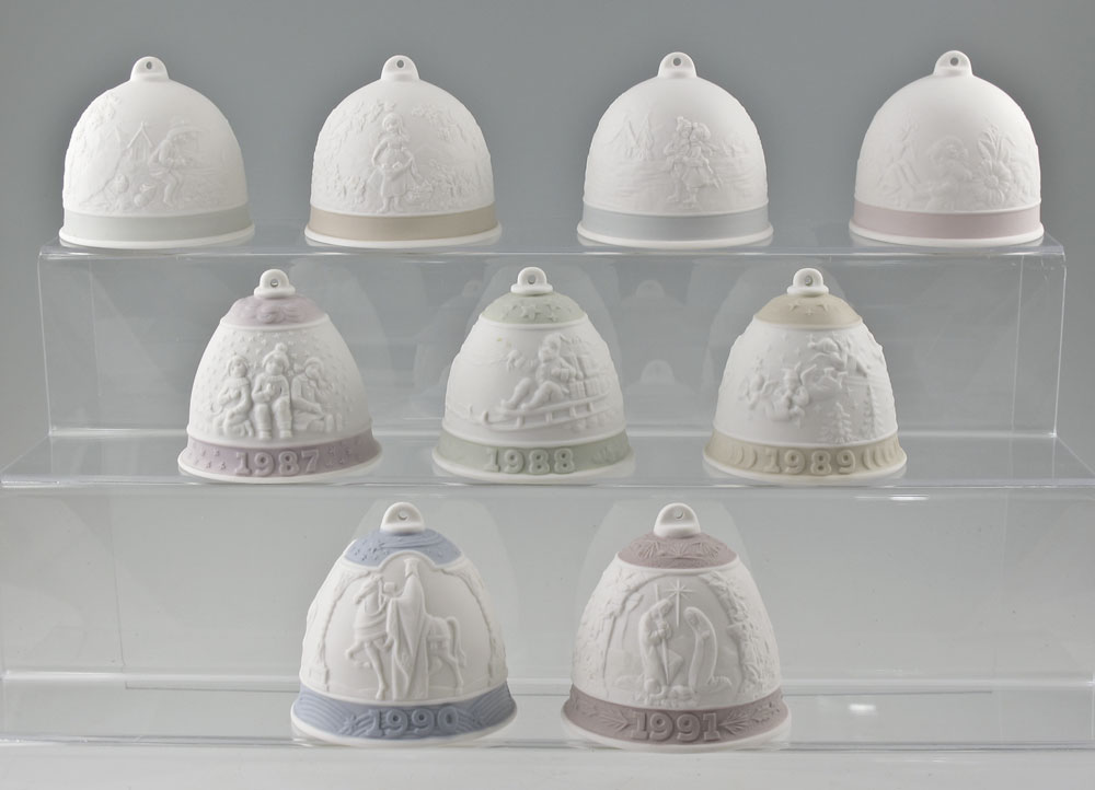 LLADRO PORCELAIN BELL ORNAMENTS: 9 Pieces to include, Jose Roig designer - 1987 Christmas #5458, 2 3/4''; 1988 Christmas #5525, 3''; 1990 Christmas #5641, 2 3/4''. Francisco Polope designer - 1989 Christmas #5616, 3''; 1991 Christmas #5803, 2 3/4''; 1991 Spring #7613, 2 1/4''; 1992 Summer #7614, 2 3/4''; 1993 Fall #7615, 3''; 1994 Winter #7616, 3''. All with boxes, sold as a lot.