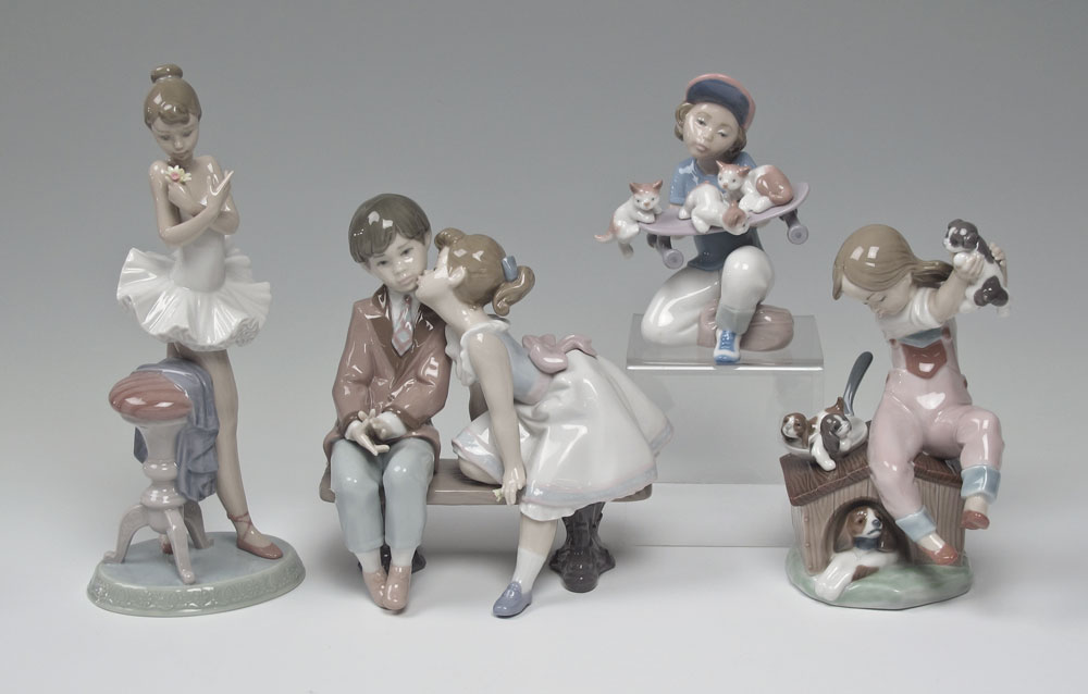 LLADRO PORCELAIN SOCIETY FIGURINES: 4 pieces to include, 2 designed by Salvador Debon - Event Piece 1992 PICK OF LITTER #7621, 7 1/4''h. & Event Piece 1994 LITTLE RIDERS #7623, 5 3/4''; Society Piece 1995 TEN & GROWING #7635, 7 1/2''; Event Piece 1995 PERFECT PERFORMANCE #7641, 4 3/4''. All with boxes, sold as a lot.