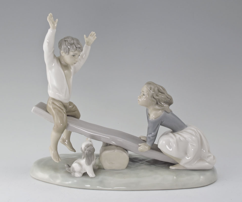 LLADRO PORCELAIN FIGURINE: SEE-SAW #4867, aka Swing, Fulgencio Garcia designer, issued 1974 retired 1996, 7 3/4'' x 9'', no box.