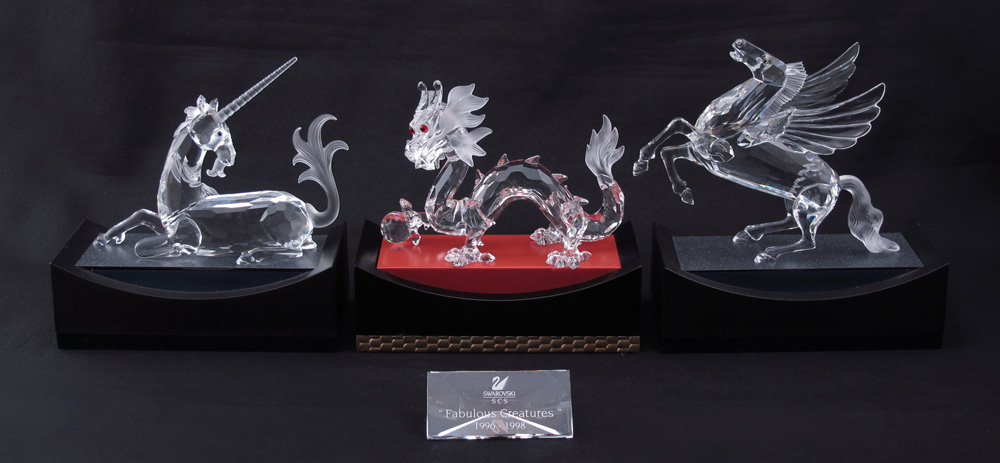 3 PC SWAROVSKI CRYSTAL ''FABULOUS CREATURES'' ANNUAL EDITION SERIES: 1996 Unicorn, Martin Zendron designer, 4 3/8'', reattached horn and tail; 1997 Dragon, Gabriele Stamey designer, 5 1/2'' & 1998 Pegasus, Adi Stocker designer, 6''. All with stands, boxes and certificates. Also sold with the series title plaque, with box.