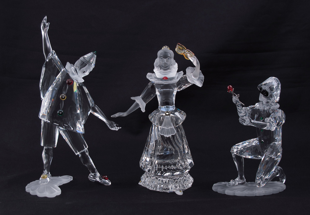 SWAROVSKI CRYSTAL ''MASQUERADE'' ANNUAL EDITION SERIES: Retired, Adi Stocker designer of all, 1999 Pierrot figures, 8''; 2000 Columbine, 7''; and 2001 Harlequin, 5 1/8''. All with boxes. Also sold with the title plaque, with box.