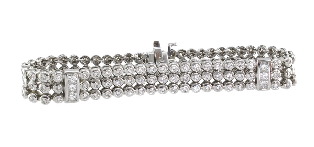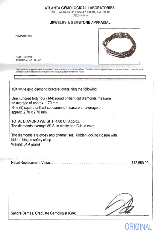 18K TRIPLE STRANDS OF DIAMONDS BRACELET: 18K white gold bracelet of 144 round brilliant cut diamonds, all totaling approx. 4 Ct., rated VS-SI in clarity and G-H in color. Diamonds are gypsy and channel set. Hidden locking closure with hidden hinged safety clasp. Length 7''. Weight 34.4 grams. Sold with current Atlanta Gemological GIA graduates appraisal for $12,550.