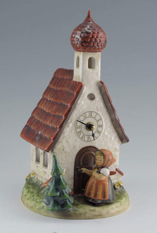 HUMMEL ''CHAPEL TIME'' PORCELAIN CLOCK: Century Collection, ''Chapel time'' is a working clock, modeled by master sculptor Gerhard Skrobek in 1982 as part of the Century Collection. Released in 1986 and produced for only one year. Battery operated clock currently keeping time, 11 1/2''h., with original box.