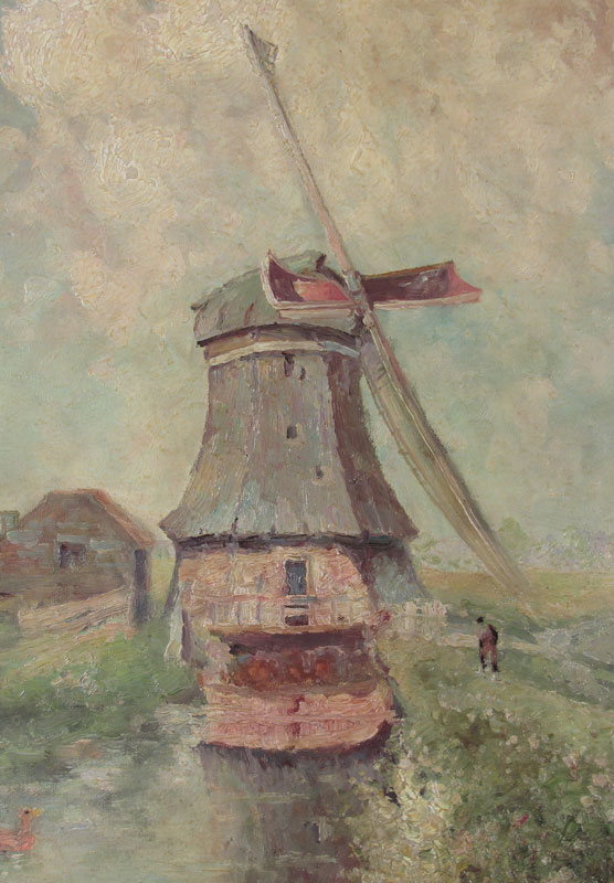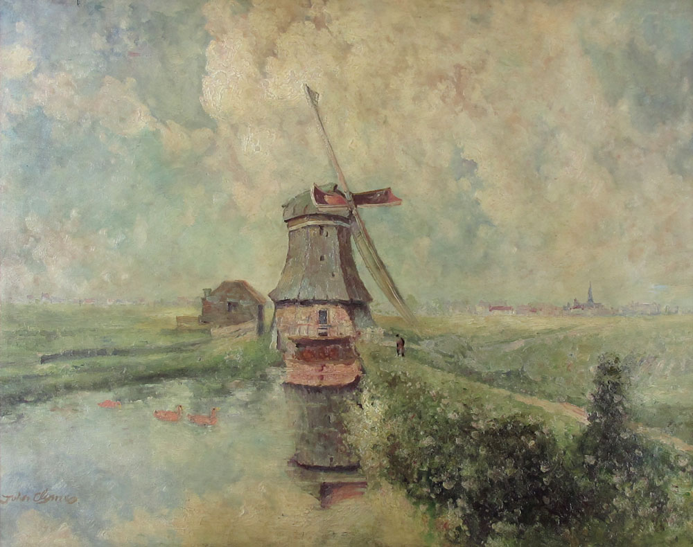 CLYMER, John, (American, 20th century): Dutch Windmill Scene, OIL/Canvas, 24 1/2'' x 30'', signed, carved gesso frame, 34'' x 39 3/4''.