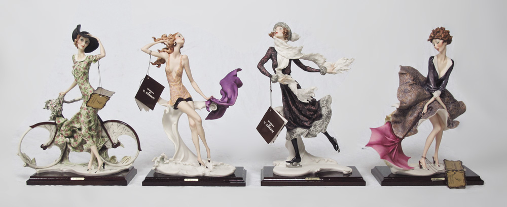 GIUSEPPE ARMANI 1989 SEASONAL FIGURINES: Spring GIRL WITH BICYCLE 539 C; Summer GIRL AT SEA 540 C; Fall GIRL WITH UMBRELLA 541 C; Winter GIRL WITH ICE SKATES 542 C. ''Florence sculture d'arte'' Made in Italy, with boxes and coa. Sold as a lot.