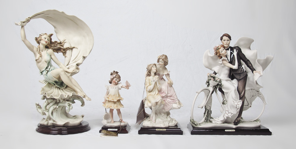 4 GIUSEPPE ARMANI LIMITED EDITION FIGURINES: To include, YOUNG DREAMS 955 P; GIRL WITH BUTTERFLY THE ENCOUNTER 1137; GIRL WITH SCARF WIND SONG 904 C; MARRIED COUPLE ON BIKE 814 C. ''Florence sculture d'arte'' Made in Italy, with boxes and coa. Sold as a lot.