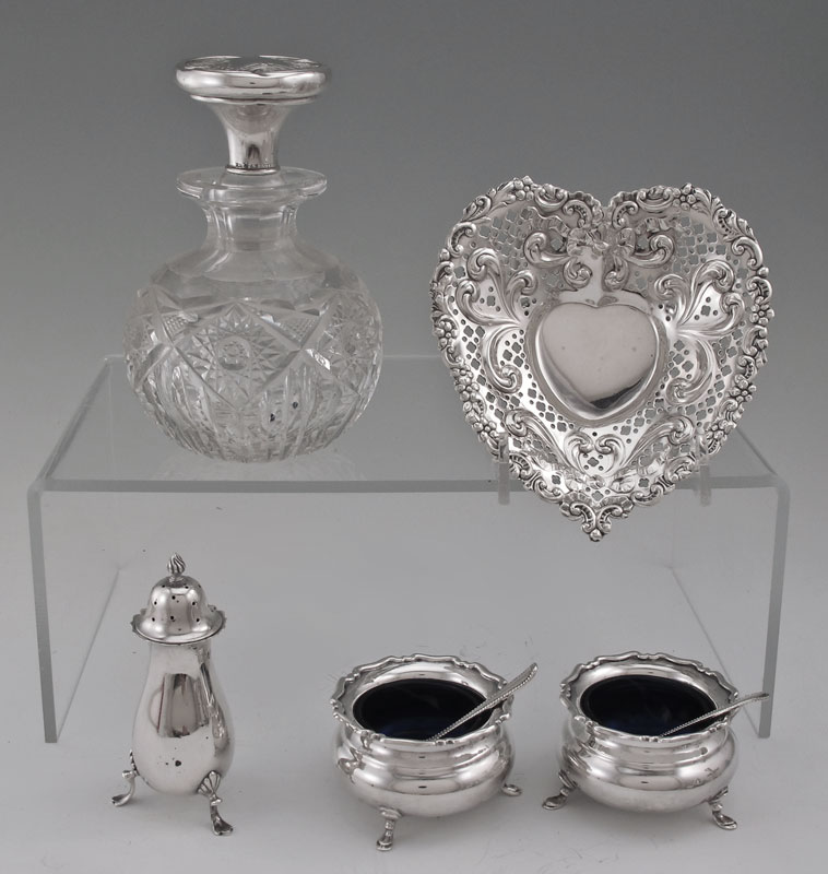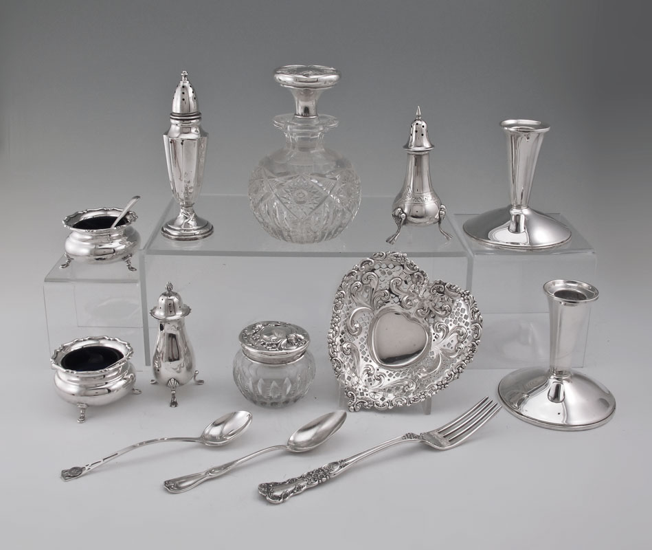 ESTATE COLLECTION OF STERLING SILVER ITEMS: To include 1) 1928 Harry Atkin English salts with cobalt inserts and spoons. 2) 1902 Jay, Richard Attenborough English salt shaker. 3) Gorham heart shaped pierced nut dish, 1 1/4'' h. x 5'' x 4 3/4''. 4) Baltimore Silversmiths salt shaker. 5) Pair of Alvin weighted sterling candlesticks. 6) Wallace sterling mounted stopper cut glass decanter. 7) Cut glass jar with sterling lid. 8) Gorham fork in the Buttercup pattern, 7 1/2''. 9) 2 sterling spoons. Total Approx. 10.9 troy oz.