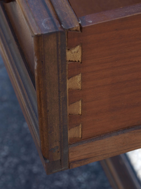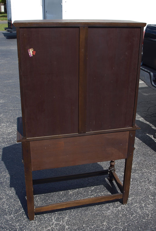 LAMMERT FURNITURE 1930's PAINT DECORATED WALNUT CHINA CABINET: Blind storage with center door having original paint decoration, full length drawer. Approx. 5' 1.'' tall x 36'' x 16''.
