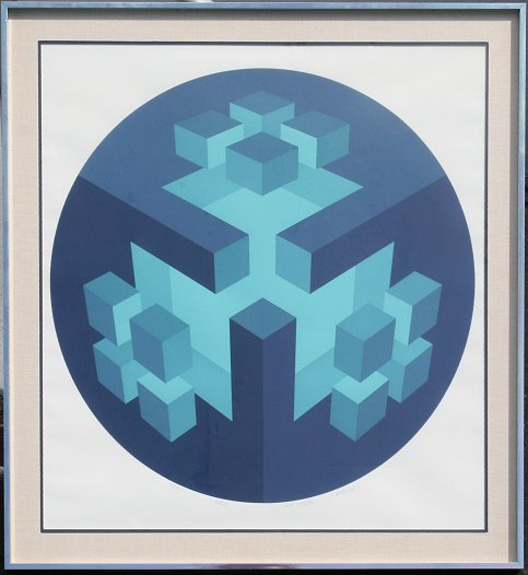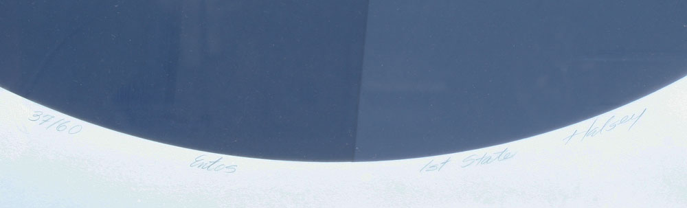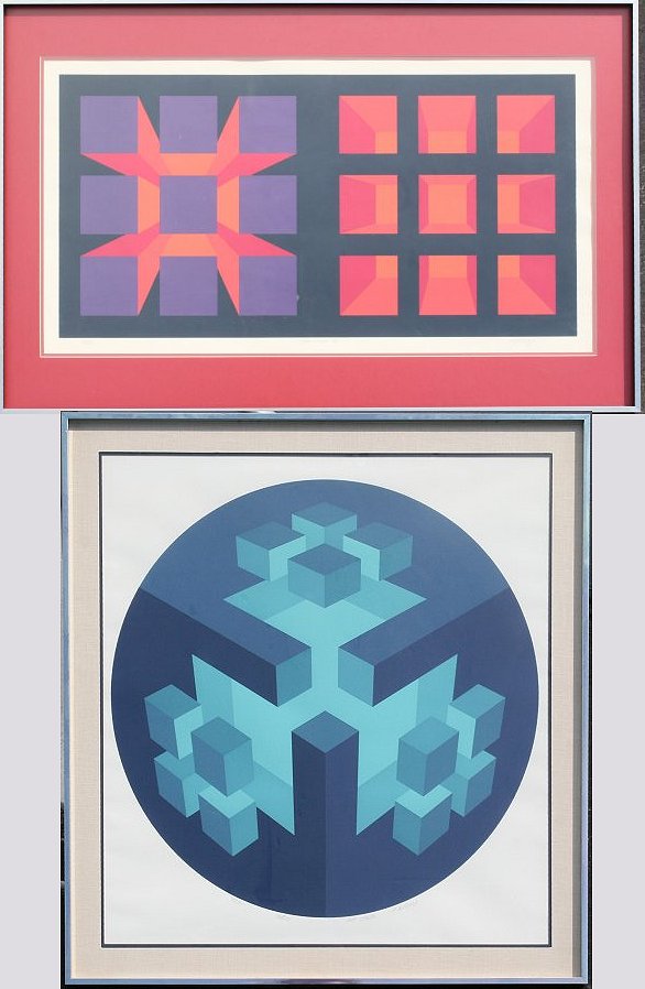 HALSEY, Brian, (American, 1942-): 2 pieces to include 1) ''Alpha-Omega II'', Serigraph, sight size 20'' x 38'', pencil signed, titled and numbered 87/90, framed, 28 1/4'' x 44 1/4''; 2) ''Entos'', Serigraph, sight size 29'' x 27 1/2'', pencil signed, titled and numbered 37/60, framed, 34 1/4'' x 32 1/2''. Like Vasarely, for half the price!