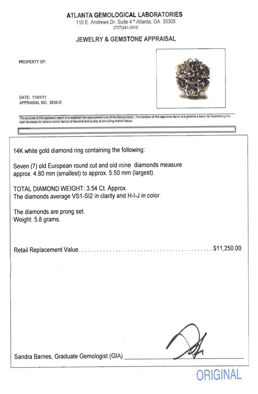 3.54 CTW DIAMOND CLUSTER RING: 14K white gold ring show off 7 old European cut and old mine cut diamonds, all totaling approx. 3.54 Ct., averaging VS1-SI2 in clarity and H-I-J in color. Weight 5.8 grams. Diamonds are prong set. Sold with current Atlanta Gemological GIA graduates appraisal for $11,250.