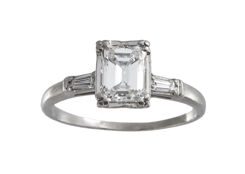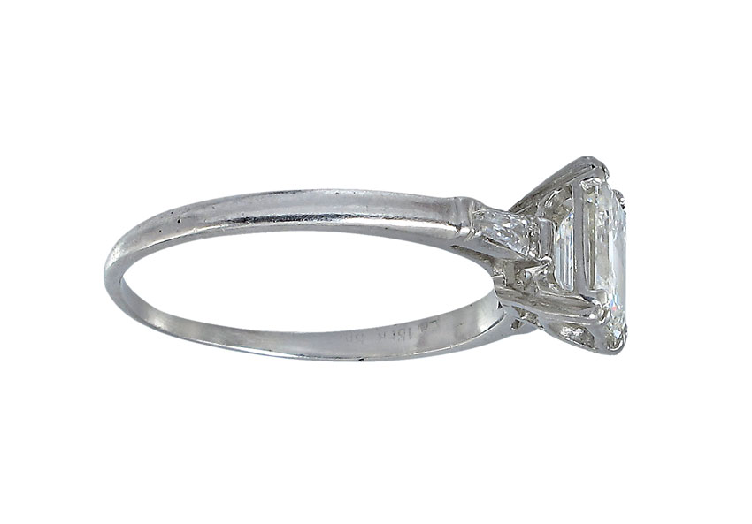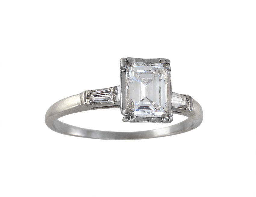 PLATINUM .80 CT DIAMOND SOLITAIRE RING CA. 1930'S: Platinum ring centers a emerald cut diamond of approx. .80 Ct, 6.21 mm x 4.83 mm., VVS2 clarity and G color. Two baguette cut diamonds flank the center stone, VS clarity and E-F color. Size 6.5. Weight 2.9 grams. Sold with current Atlanta Gemological GIA graduates appraisal for $6650.