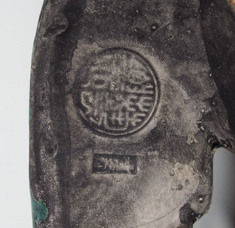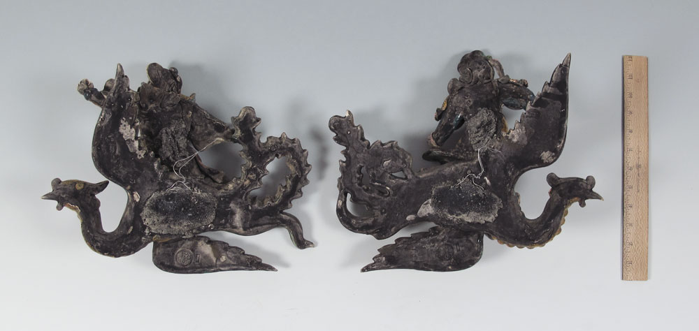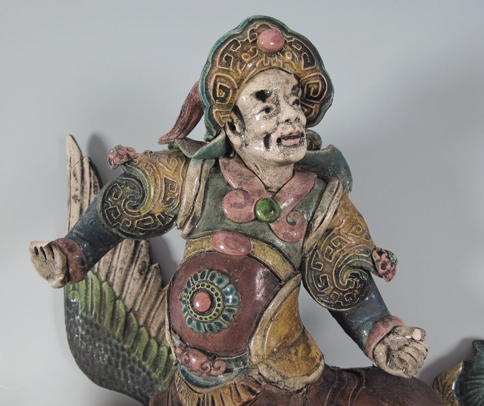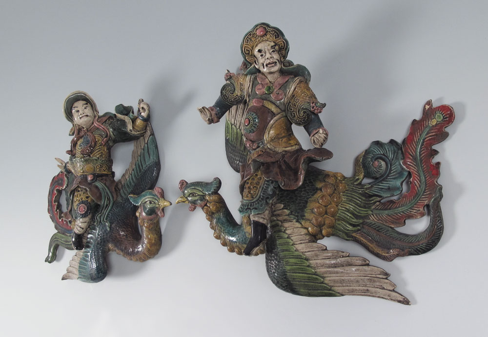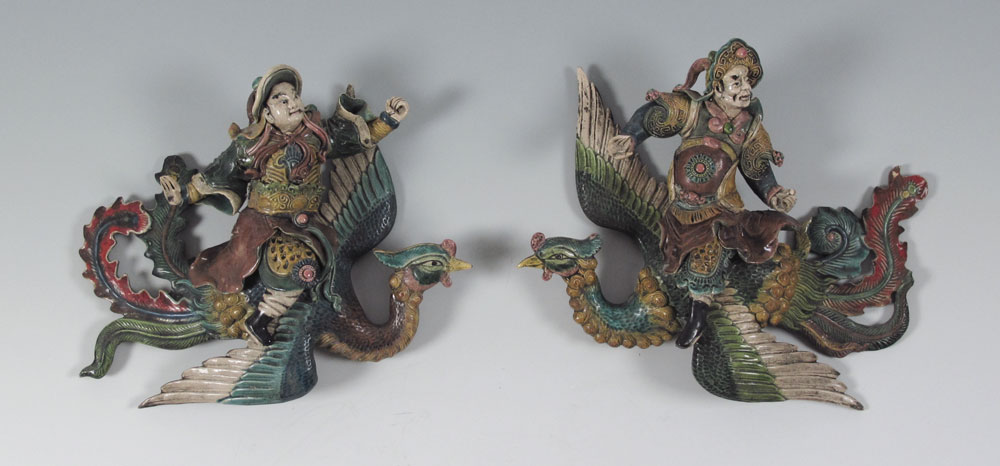 PAIR CHINESE POLYCHROME FIGURAL ROOF TILES: Flying mythical birds with riders, impressed mark. 11''h. x 13''.