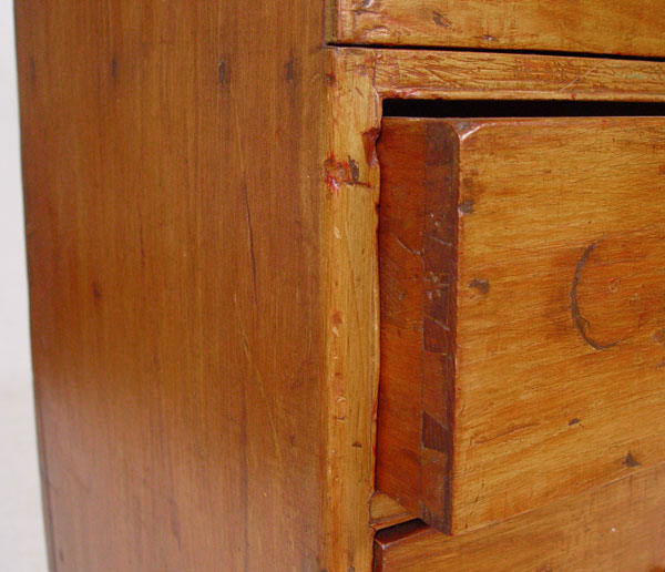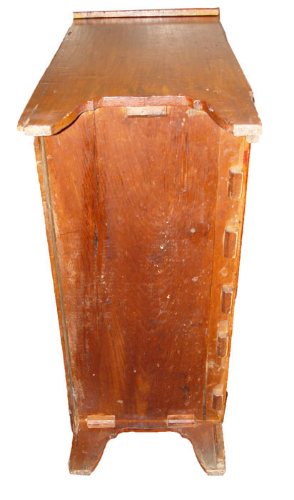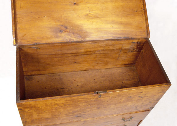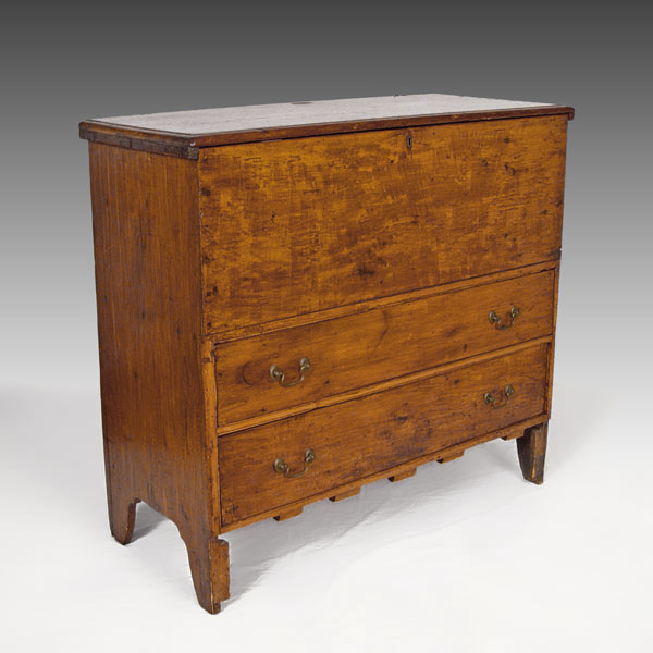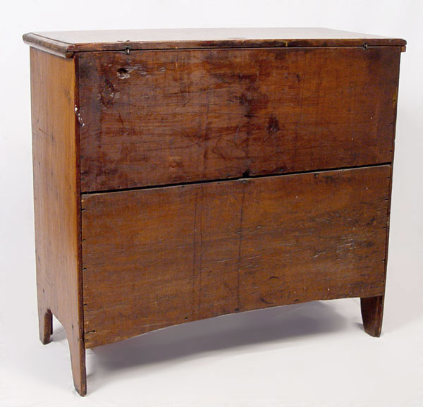 18TH CENTURY NEW YORK 2 DRAWER LIFT TOP MULE CHEST: Single hinges, 2 board back and unusual base cutouts. Front base panel missing below drawers. Still maintains great form which one would expect from a fine country piece. Old refinish, both drawers with early bale handles, not original to the piece. 38'' h. x 41'' x 18''