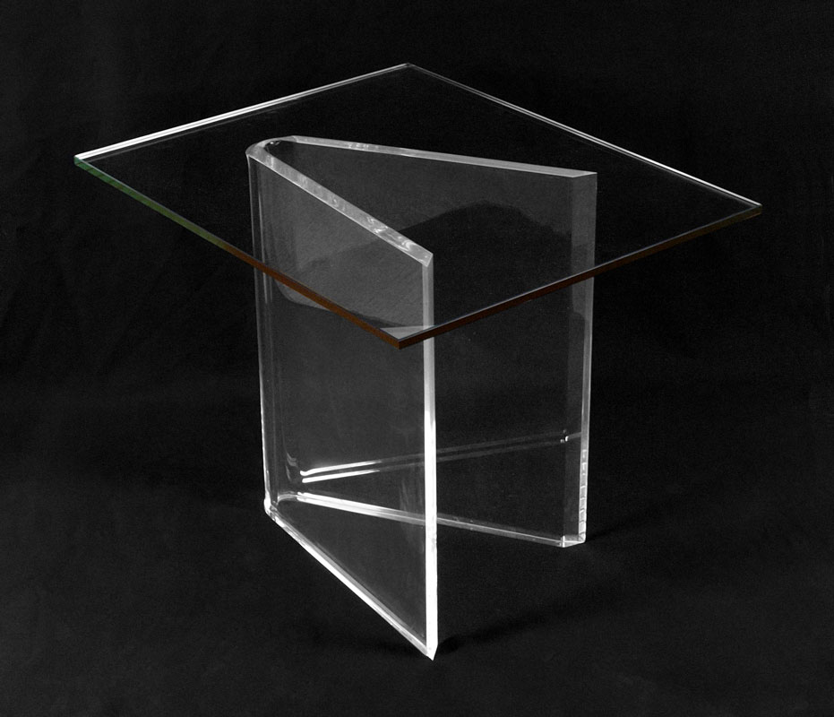 GLASS TOP LUCITE BASE SIDE TABLE: V shaped lucite base with thick glass top. 22 1/4'' h. x 27 1/4'' x 22''.