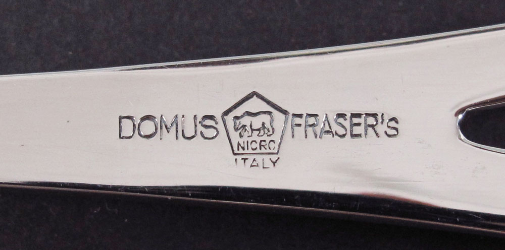 GIO PONTI FRASER'S STAINLESS STEEL FLATWARE SET: Designed by Gio Ponti, marked Fraser's Domus to 77 pieces to include 12 forks 8 1/2'', 12 salad forks 7 5/8, 25 teaspoons 6 3/4'', 15 soup spoons 7 5/8'', 13 knives 8 3/4'', sold with L.S. Ayers and Co. bags and plastic sleeves.