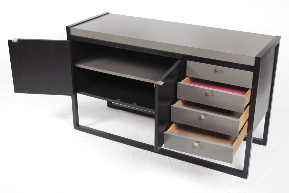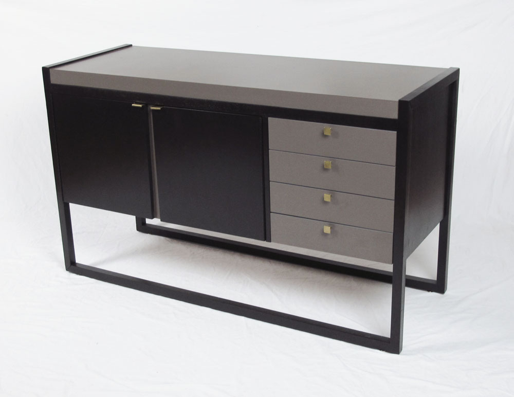MID CENTURY LAMINATE SERVER: Rapids Furniture Co. tag, 2 doors with 4 drawers. 31 1/2'' h. x 53'' x 19''.