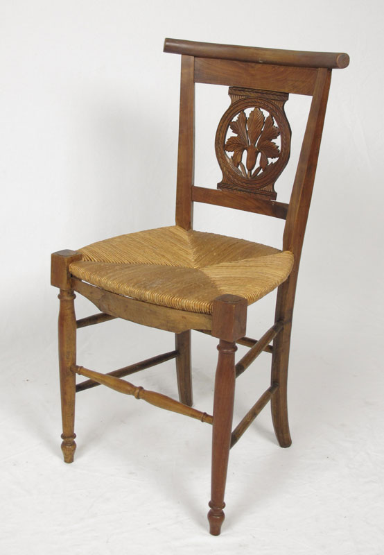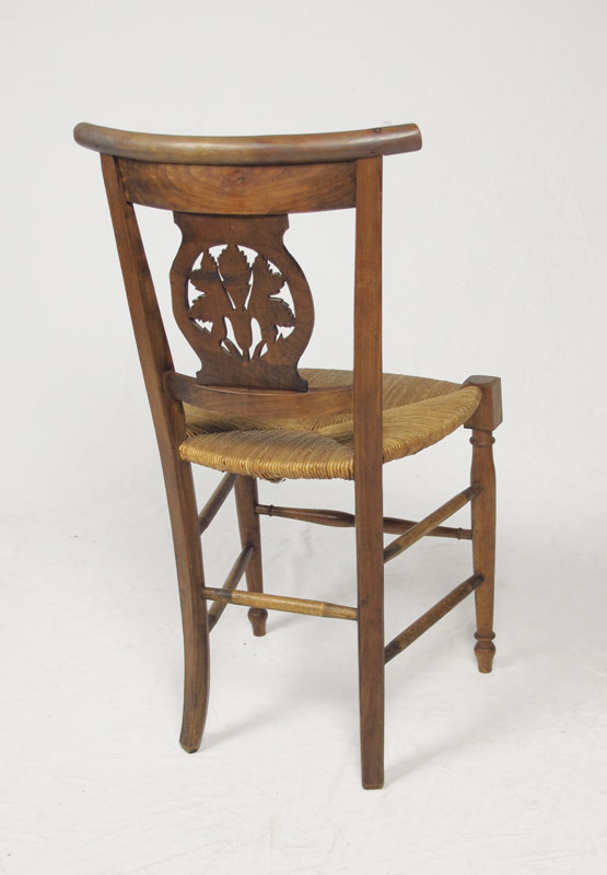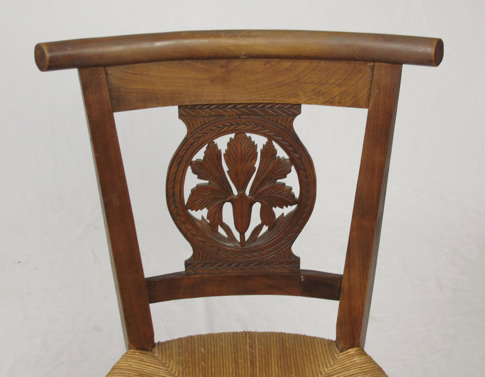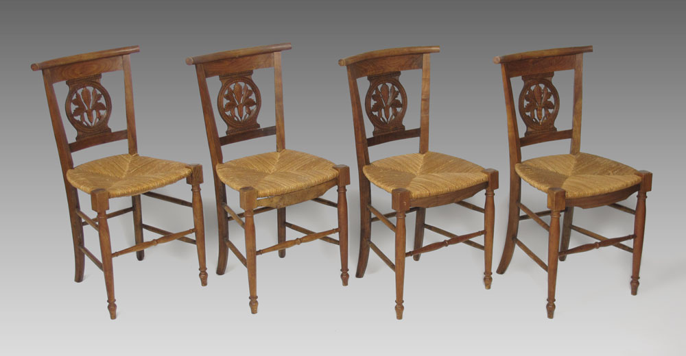SET OF 4 BRITISH COLONIAL SIDE CHAIRS: Open cut and carved central splat under curved top rail, rush seat, tapered and turned legs. Approx. 32'' tall x 17'' wide x 14'' deep.
