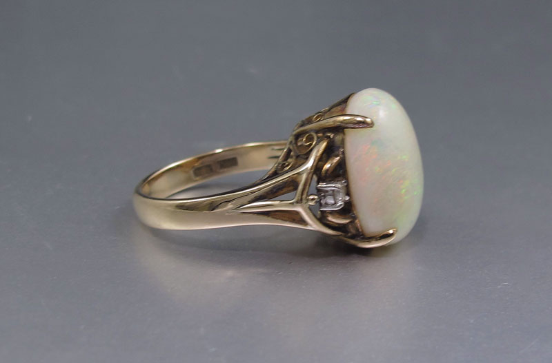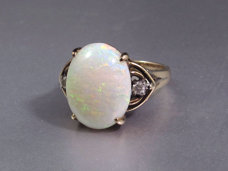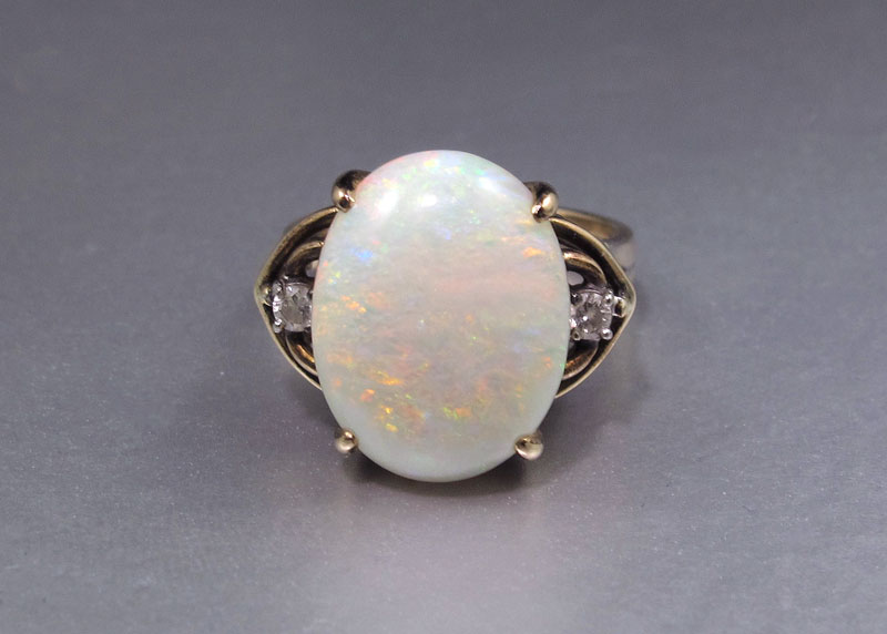 7 CT OPAL RING WITH DIAMONDS: 14K yellow gold ring contains one oval shaped cabochon cut white opal. Weight: 7.00 Ct. Approx. The opal has white base with green/blue and red/orange pin-fire play-of-color. Two round full cut diamonds. Weight: .10 ct. Approx. The diamonds average VS in clarity and H-I in color. The opal and diamonds are prong set. Weight: 7.0 grams. Size:7.5