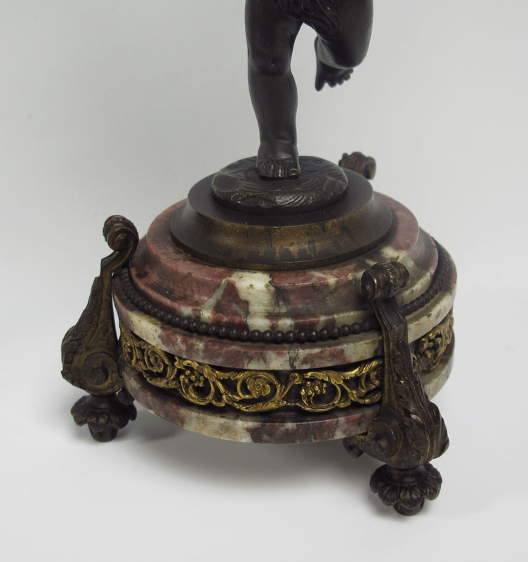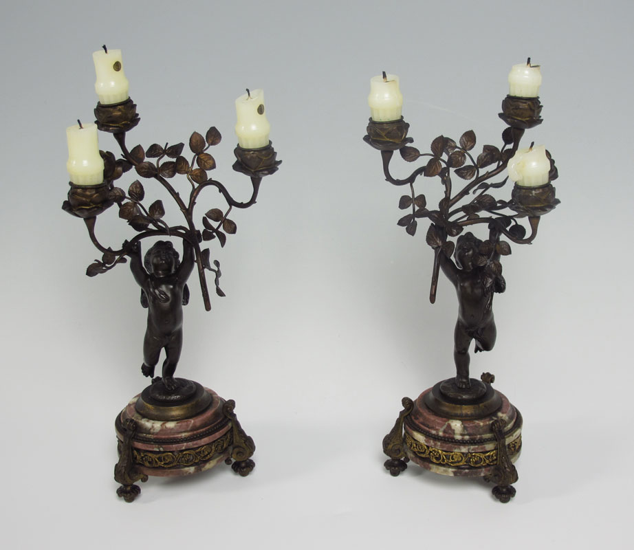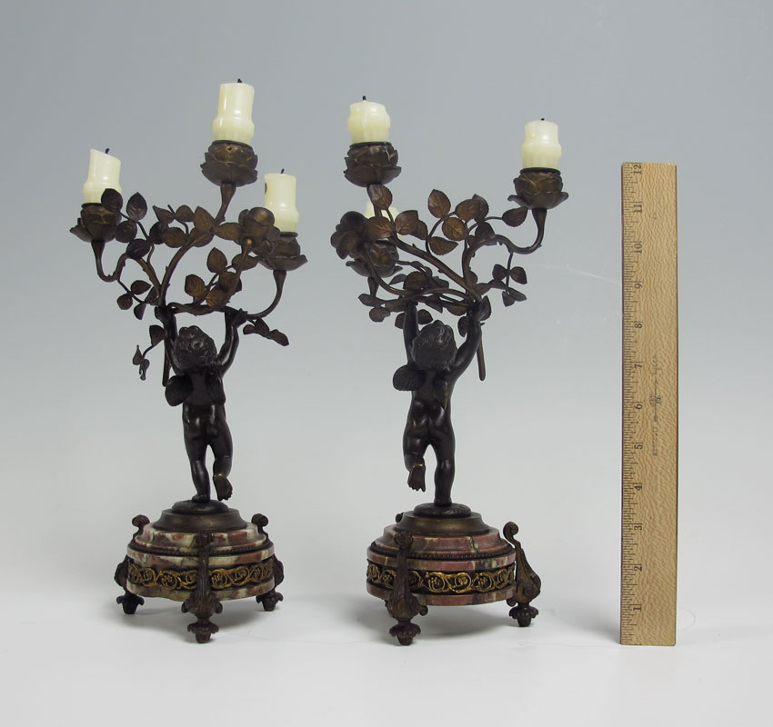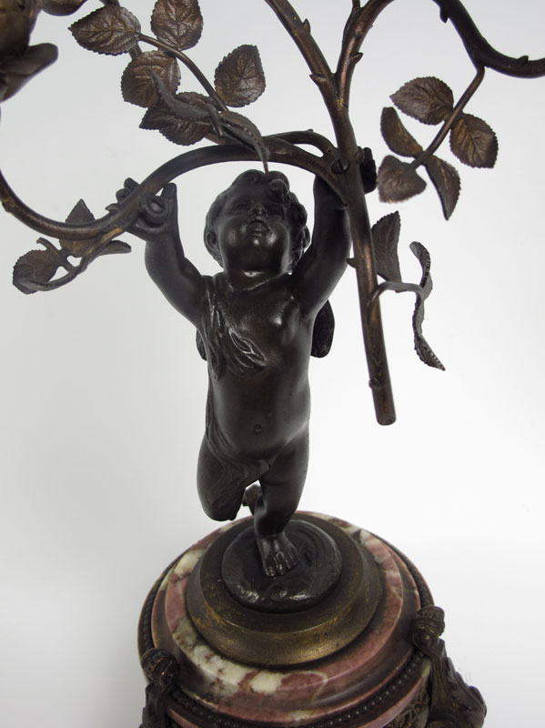 PAIR OF FRENCH BRONZE PUTTI CANDELABRA: Winged cherubs support the life like roses and vine ending in the three lights. Marble and metal mounted base. 12'' tall.