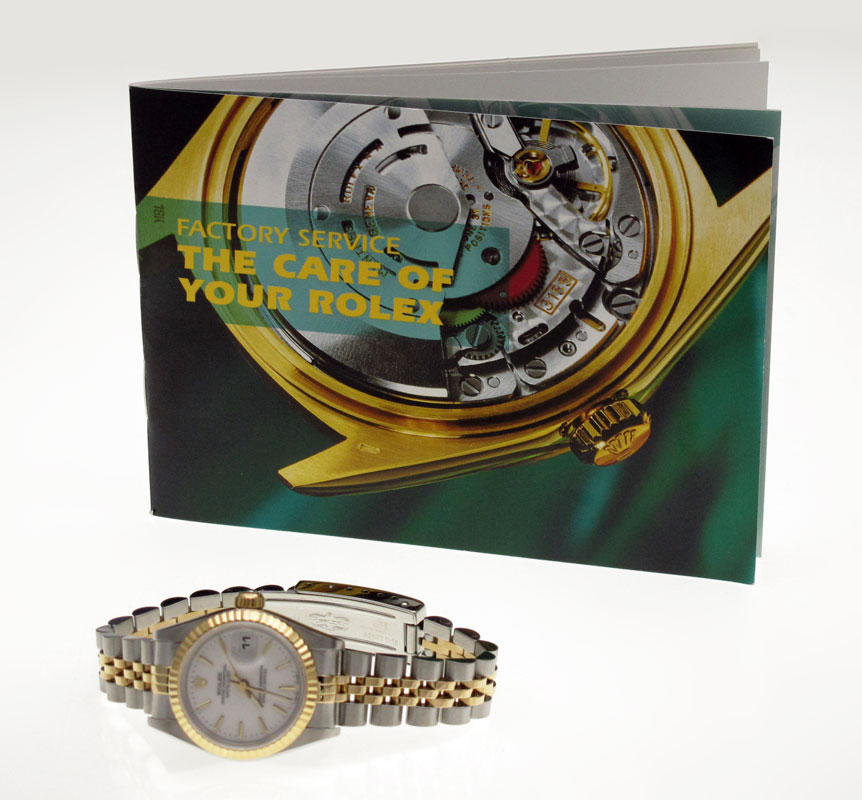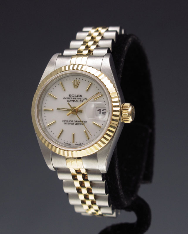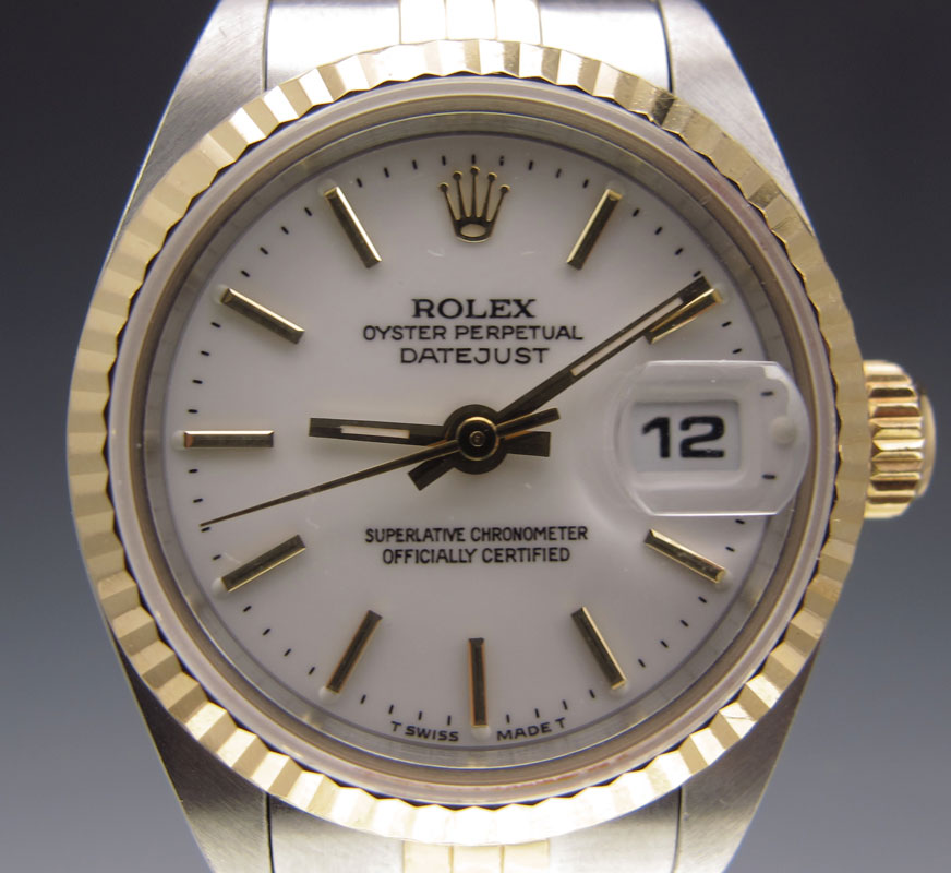 ROLEX 18K TWO TONE LADIES WRISTWATCH: 18K yellow gold and stainless watch. Model 69173, serial number T32217442, porcelain dial with gold raised batons. Quick set. This watch has been factory serviced by a Rolex certified agent.