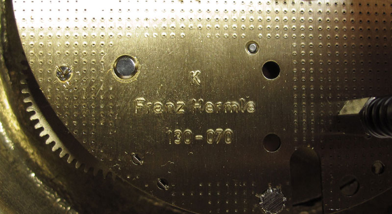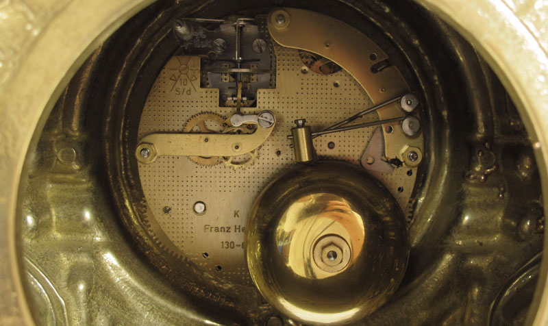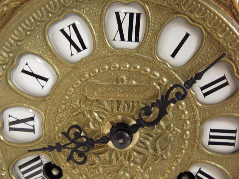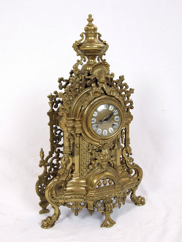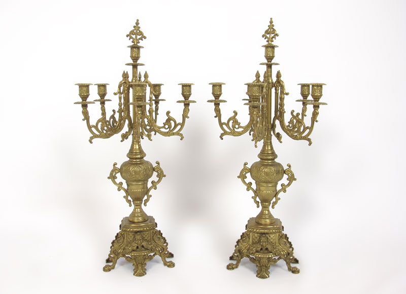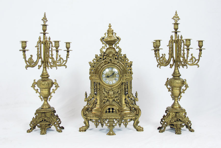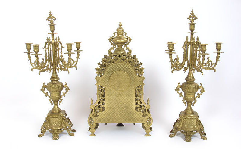 IMPERIAL 3 PIECE BRASS GARNITURE CLOCK SET: European style brass case clock with urn finial, North wind masqueron and foliate designs. Marked Imperial on face, key wind movement, key in office. 24 1/4'' h. x 14 1/2'' x 6 3/4''. Pair of matching 6 light candelabra garniture. 26 5/8'' h. x 16'' dia.