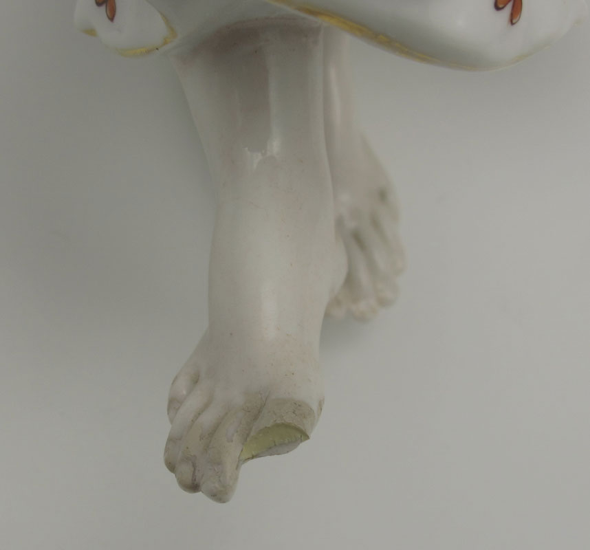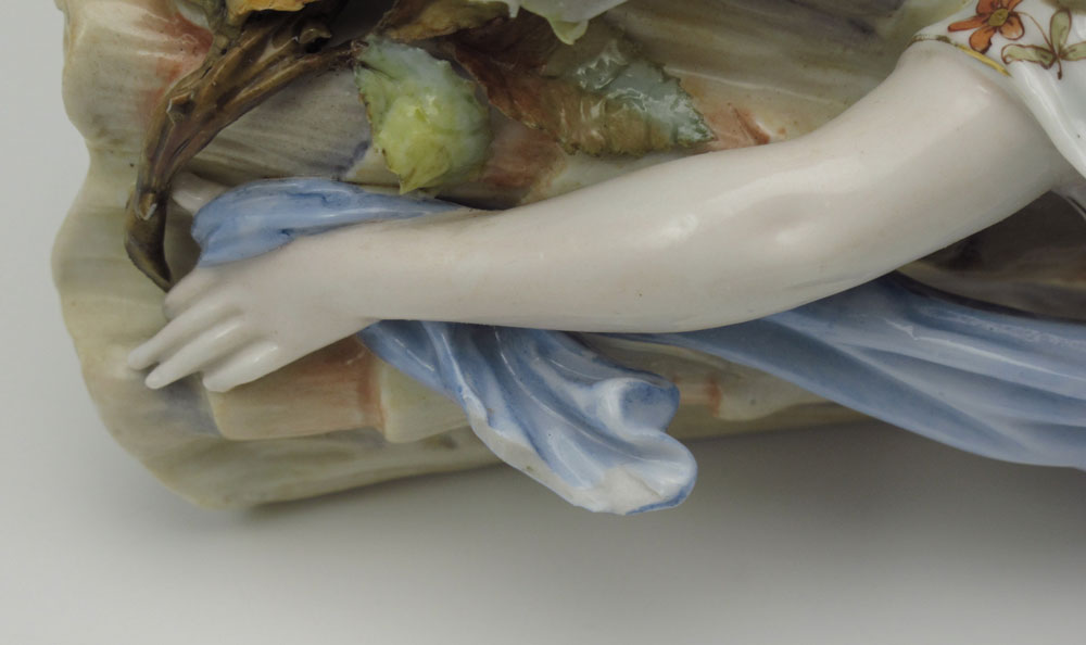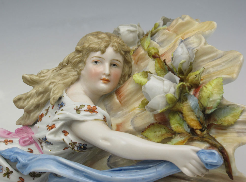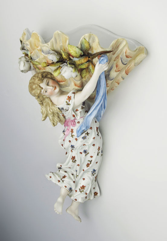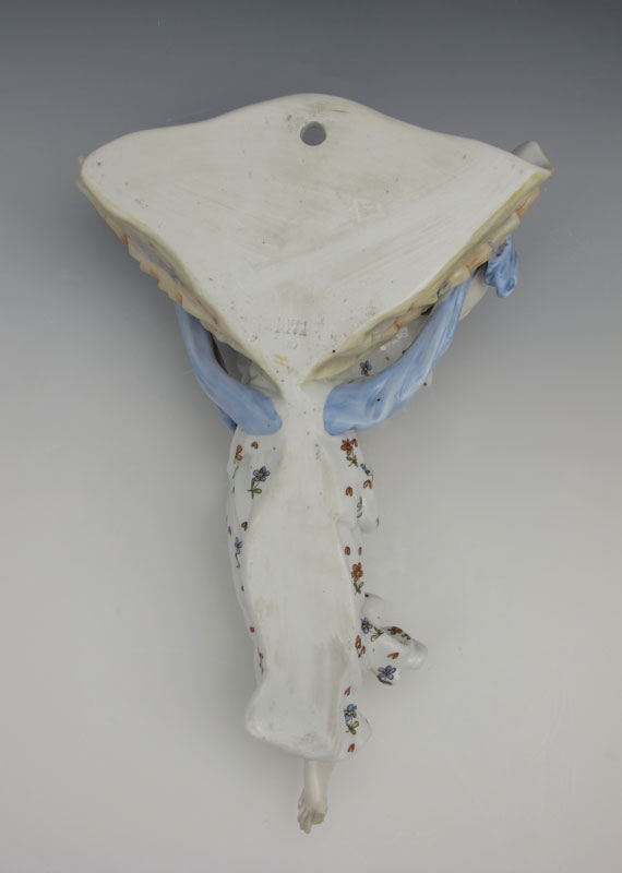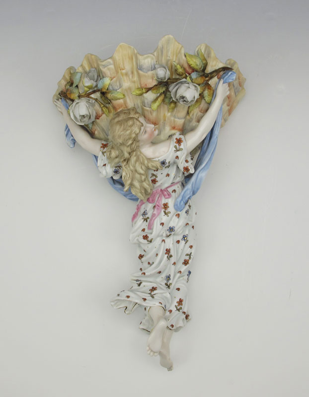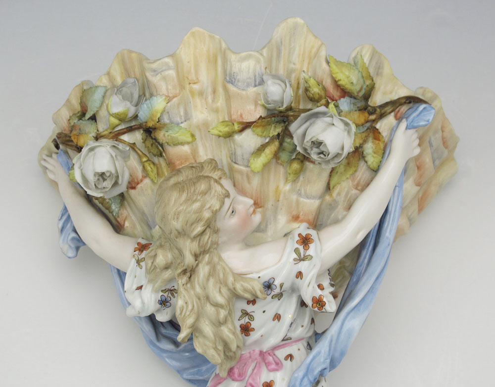 MEISSEN QUALITY FIGURAL WALL POCKET: Hand painted porcelain figure supporting a shell with applied roses. 12''h. x 7 1/2'' wide.