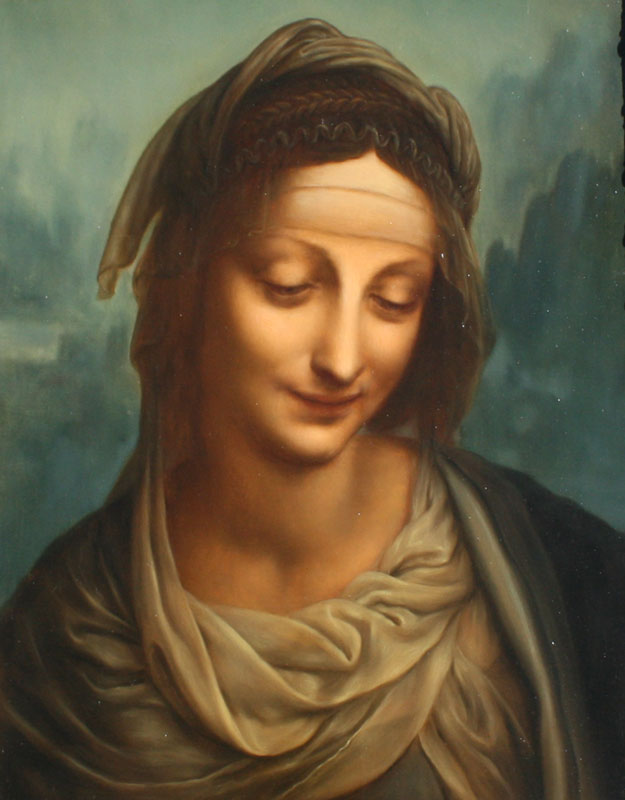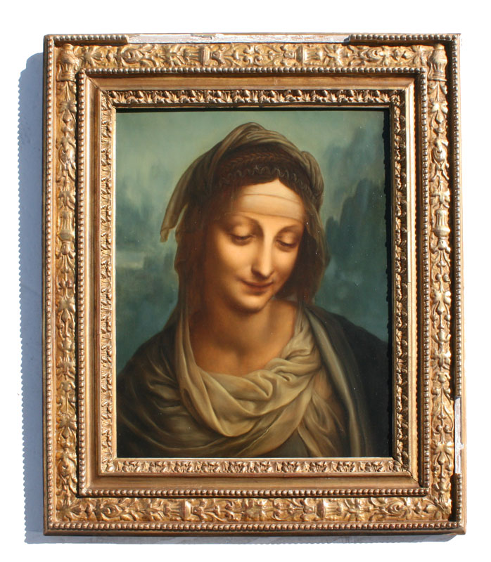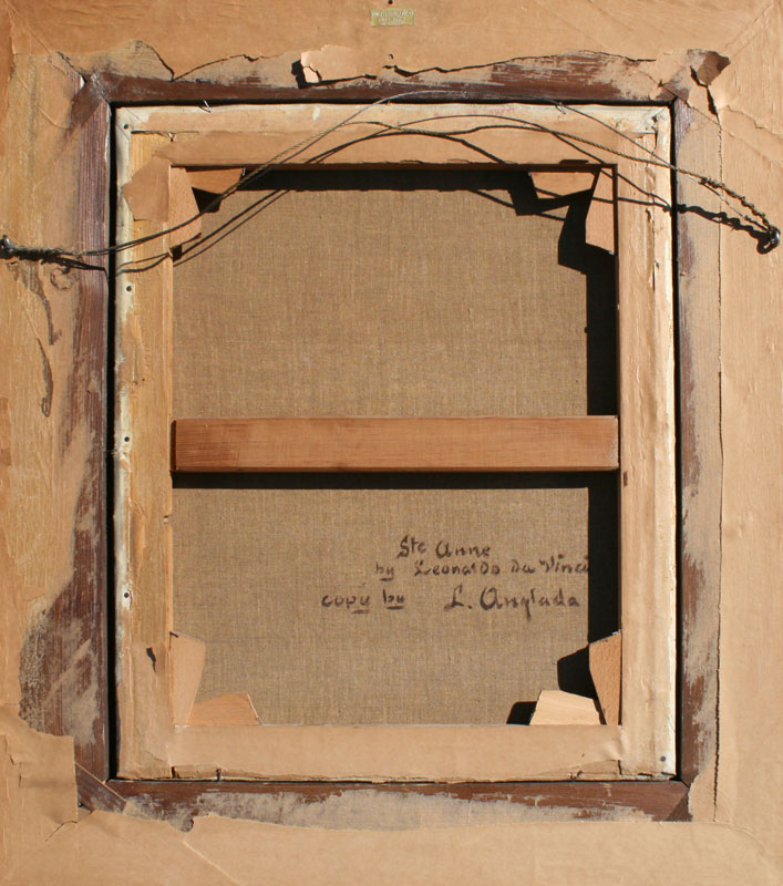 ANGLADA, L., (European, 20th C.): ''St. Anne'', a copy of the original by Leonardo da Vinci, OIL/Canvas, 18'' x 15 1/2'', encased in a Bresler frame with damage and missing gesso, 26'' x 23'', inscribed information verso on canvas.