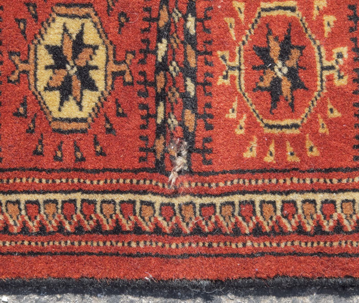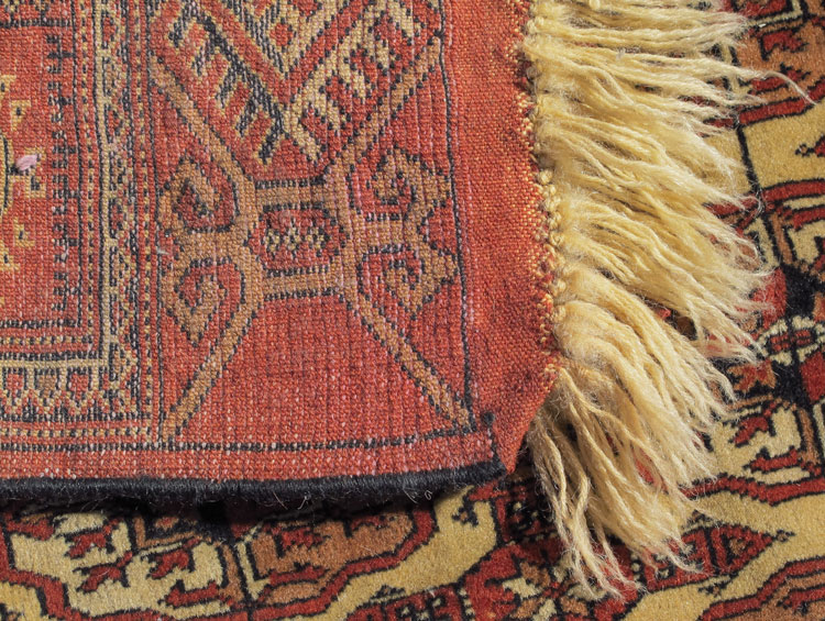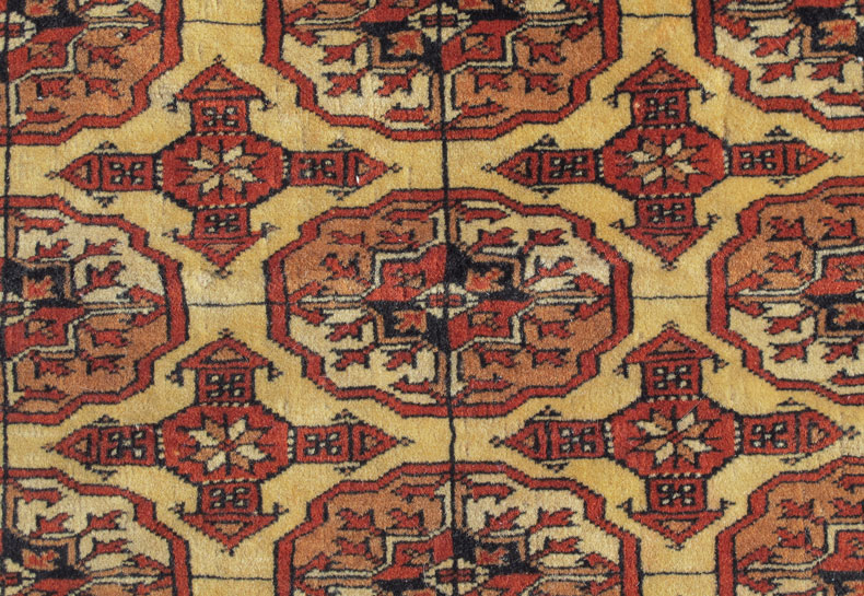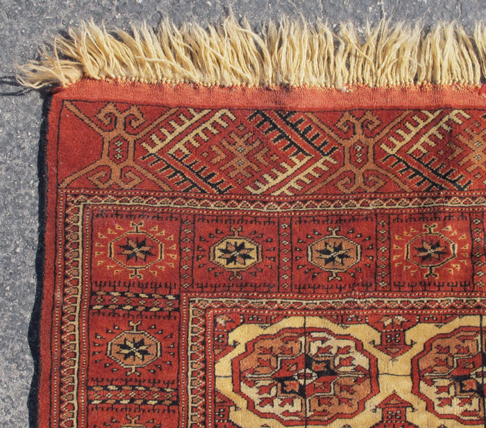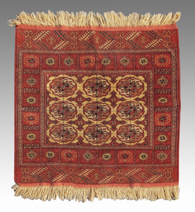 SEMI-ANTIQUE TEKKE TURKOMAN HAND KNOTTED ALL WOOL RUG, 3' 2'' x 3' 6'': This rug has a traditional design of rows of guls, called by some an elephant foot because that is what it resembles, with alternating cross like motifs. The colors are also traditional to this type of rug, the shades of reds and some blue or blue black, but it is less common for the field to be ivory. Also, the squarish shape of the rug makes it stand out. This type of rug also has aprons at either end of the rug (extra borders that aren't on the sides). Condition is good.