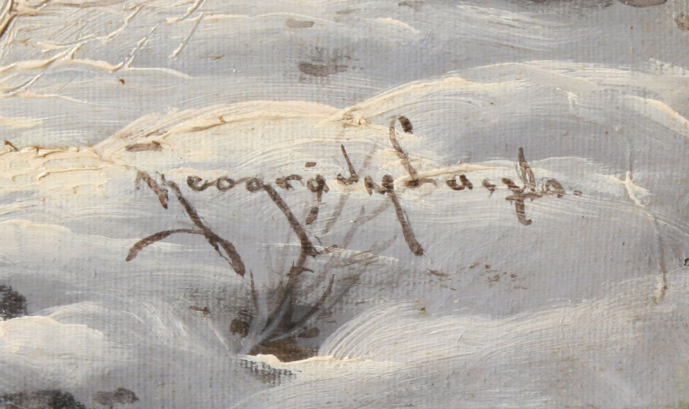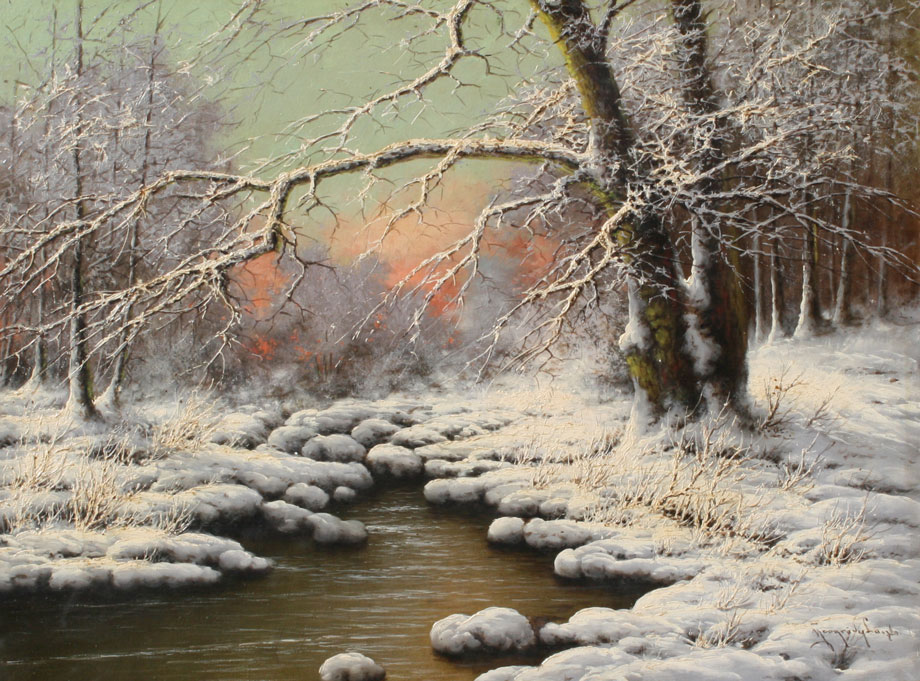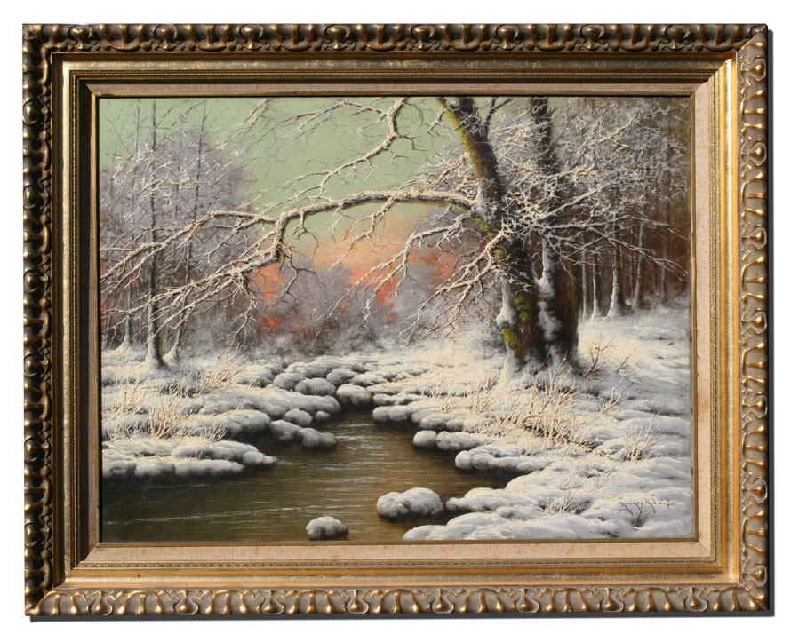 NEOGRADY, Laszlo, (Hungarian, 1896-1962): Peaceful Snow-Covered Landscape with Stream, Oil/Canvas, 23'' x 31 ¼'', signed, gilded and carved frame, 30'' x 38''.